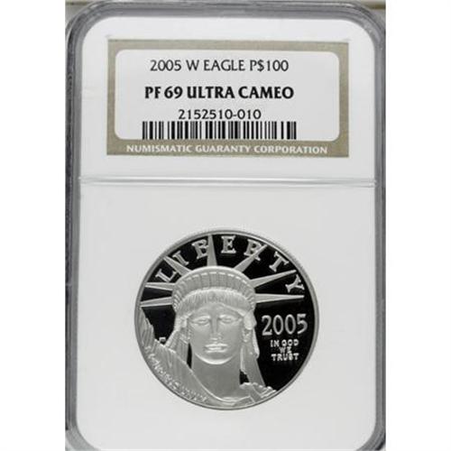 <B>2005-W $100 One-Ounce PR69 Deep Cameo NGC.</B></I> NGC Census: (0/0). PCGS Population (359/11). Numismedia Wsl. Price for NGC/PCGS coin in PR69: $2,050. (#921111)<BR><BR><b>Shipping:</b> Coins & Currency (<a target="_blank" href="http://www.heritageauctions.com/common/shipping.php">view shipping information</a>)