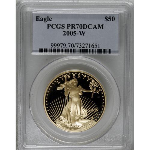 <B>2005-W G$50 One-Ounce Gold PR70 Deep Cameo PCGS.</B></I> Yet another perfect coin, one with the meticulous strike and fathomless mirrors made possible by modern technology. One of 68 assigned this grade by PCGS (2/07).<BR><BR><b>Shipping:</b> Coins & Currency (<a target="_blank" href="http://www.heritageauctions.com/common/shipping.php">view shipping information</a>)