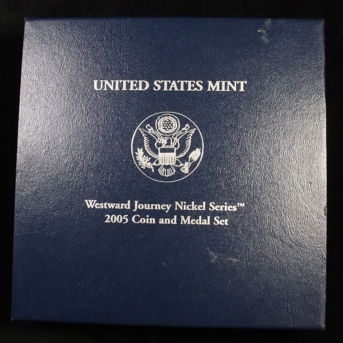 2005 Westward Journey Nickel Series - Proof Coin & Medal Set orig box w/coa . .. This 3 coin set includes a Sacagawea Dollar, Jefferson Nickel (Ocean View), Jefferson Nickel (Bison). A silver plated commemorative Peace medal is also included in this fine collector's set! Estimated Value $20