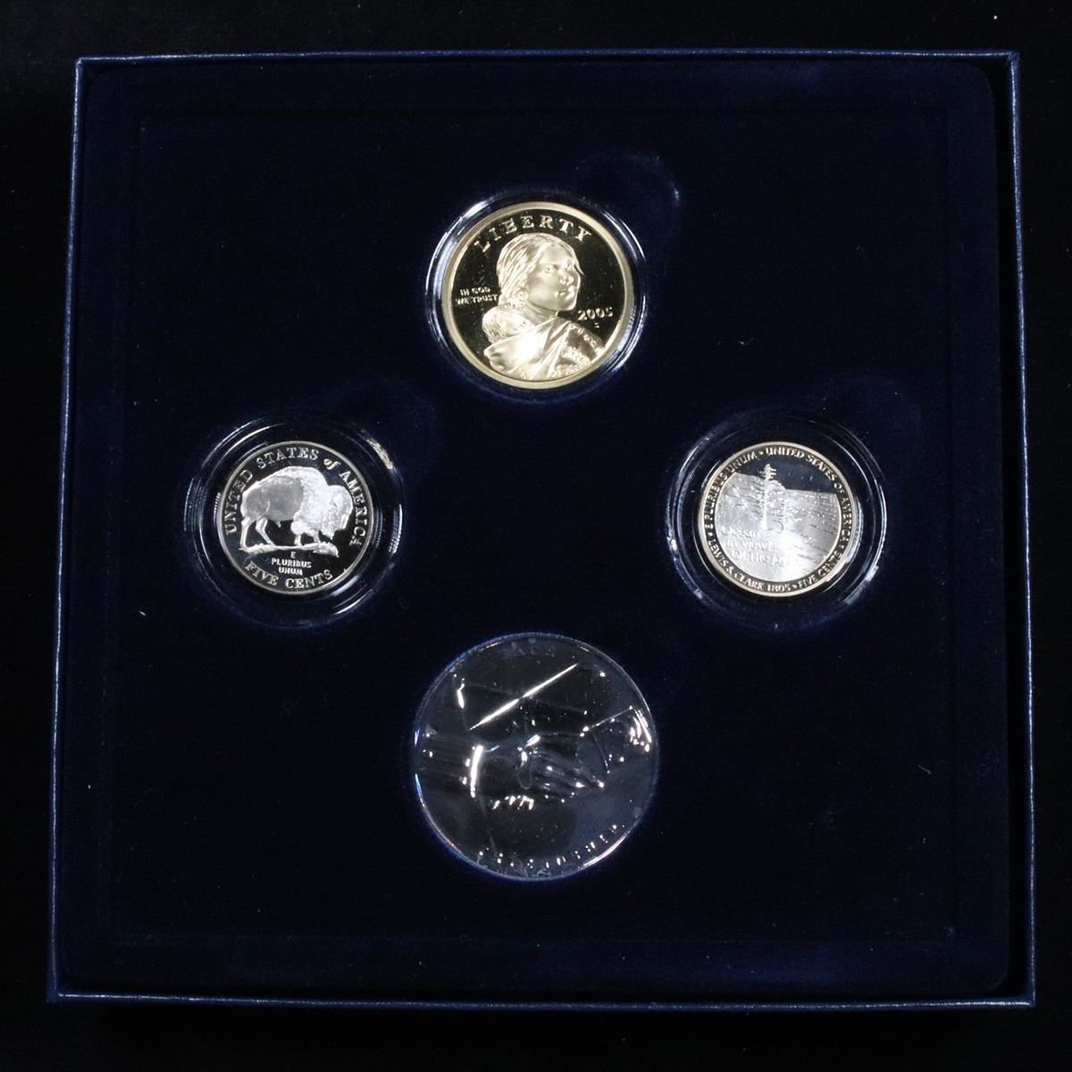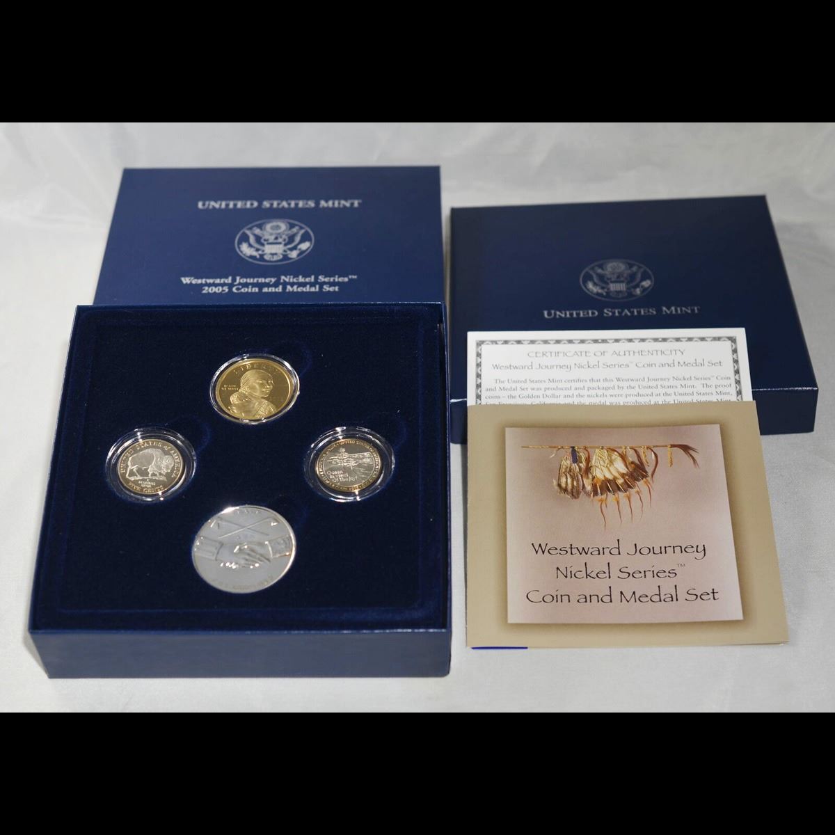 2005 Westward Journey Nickel Series - Proof Coin & Medal Set orig box w/coa . .. This 3 coin set includes a Sacagawea Dollar, Jefferson Nickel (Ocean View), Jefferson Nickel (Bison). A silver plated commemorative Peace medal is also included in this fine collector's set! Estimated Value $20