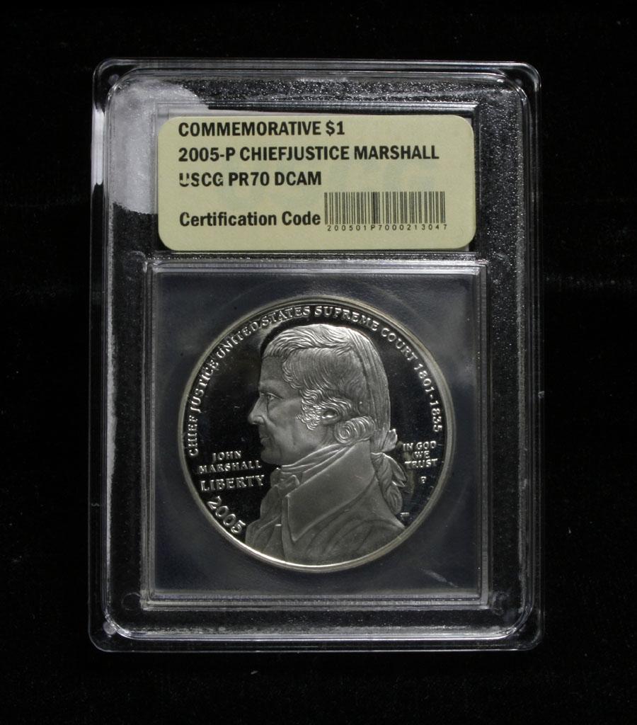 Issued to commemorate the 250th anniversary of Chief Justice John Marshall's birth. The reverse depicts the old Supreme Court chamber inside the Capitol. This is a Perfect example Grading PR70 DCAM by USCG. PCGS list pr70 at $500. Estimated Value $125