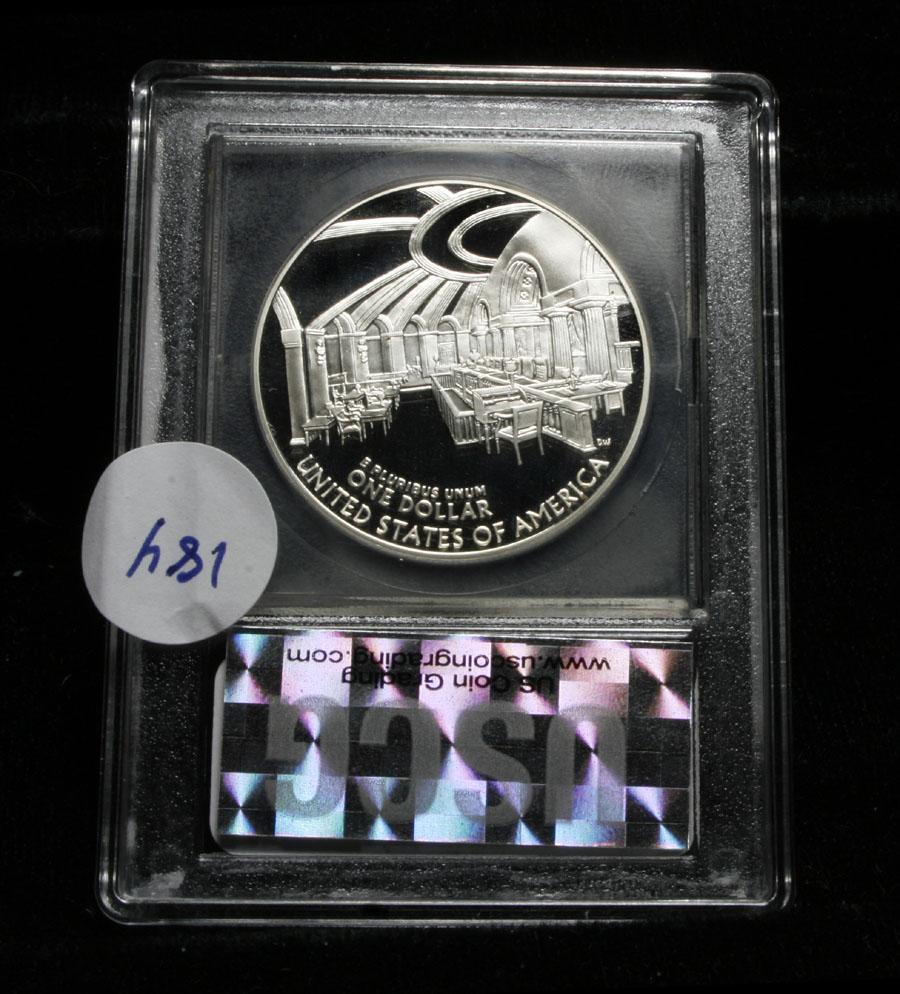 Issued to commemorate the 250th anniversary of Chief Justice John Marshall's birth. The reverse depicts the old Supreme Court chamber inside the Capitol. This is a Perfect example Grading PR70 DCAM by USCG. PCGS list pr70 at $500. Estimated Value $125