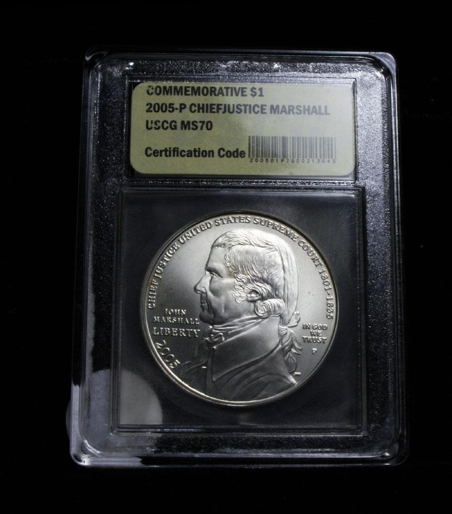 Issued to commemorate the 250th anniversary of Chief Justice John Marshall's birth. The reverse depicts the old Supreme Court chamber inside the Capitol. This is a Perfect example Grading ms70 by USCG. PCGS list ms70 at $360. Estimated Value $100
