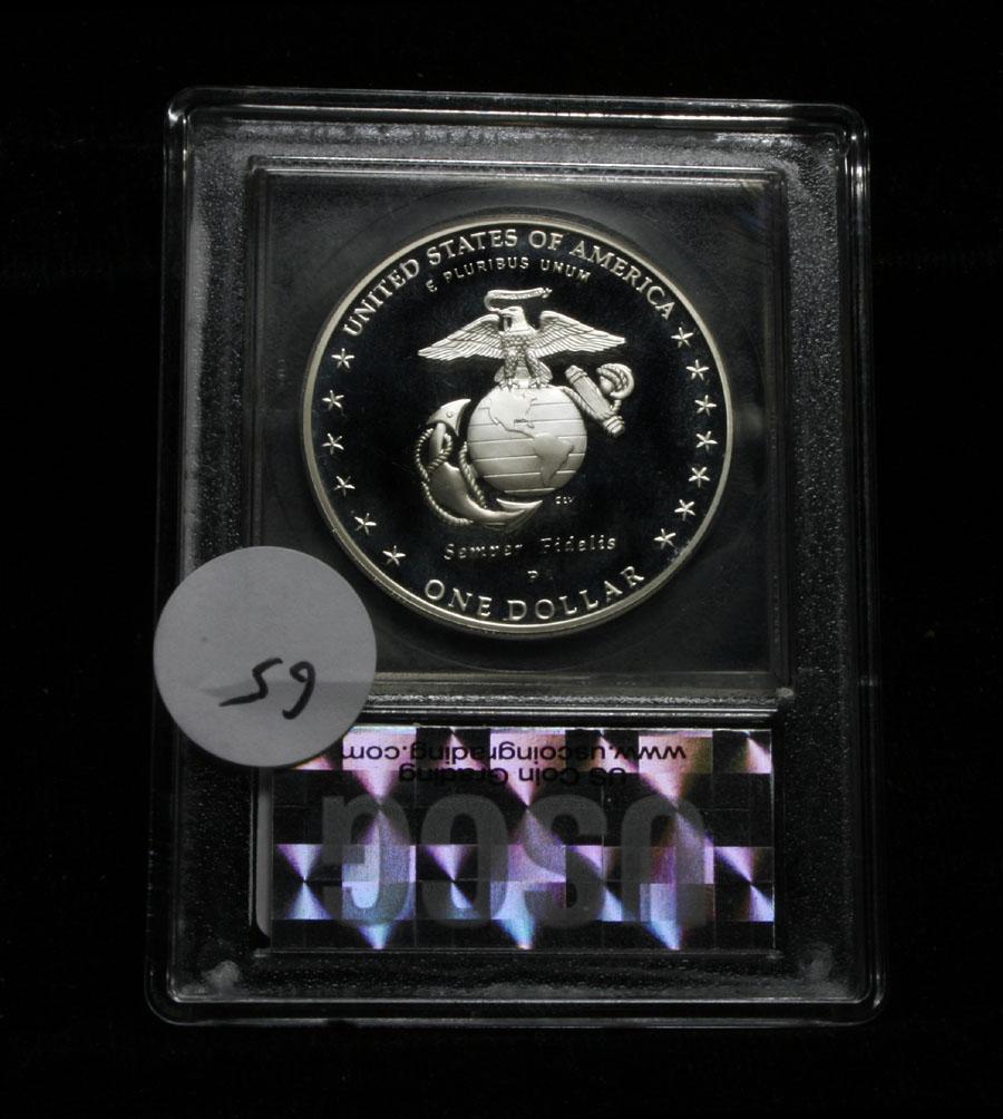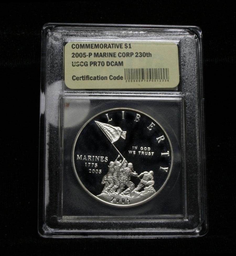 Issued to celebrate the 230th Anniversary of the formation of the United States Marine Corps. PCGS lists a PR70 DCAM at $400. This Proof Commemorative Graded Perfect PF70 DCAM by USCG. Estimated Value $125