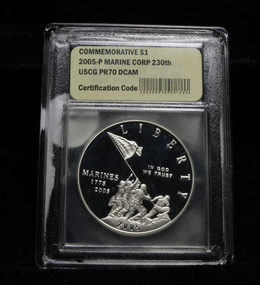 The 2005 Marine Corps Silver Dollar was issued to mark the 230th anniversary of the Marines. The design features the iconic images of the Marine Corps This is a Perfect example Grading PR70 DCAM by USCG. PCGS list PR70 at $450. Estimated Value $125