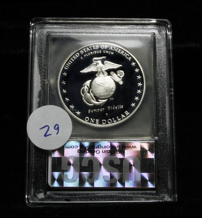The 2005 Marine Corps Silver Dollar was issued to mark the 230th anniversary of the Marines. The design features the iconic images of the Marine Corps This is a Perfect example Grading PR70 DCAM by USCG. PCGS list PR70 at $450. Estimated Value $150