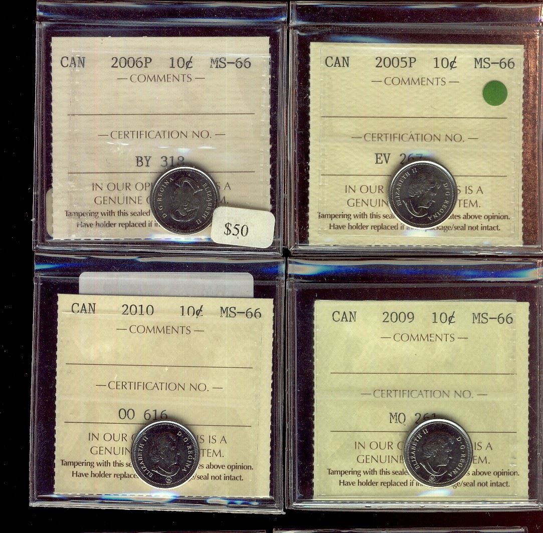 2005P 10¢, 2006P, 2009 & 2010 ICCS MS66. Lot of 4 coins.