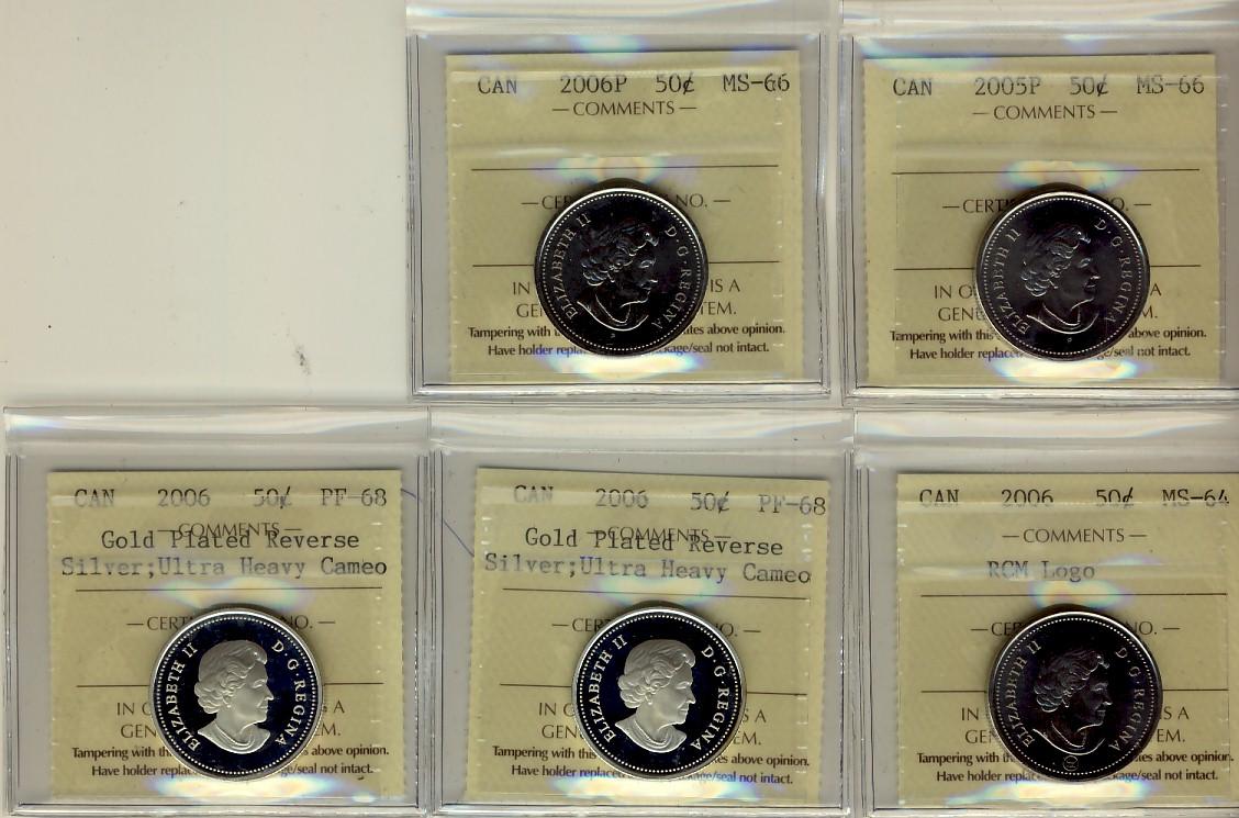 2005P 50¢, 2006P MS66, 2006 RCM Logo MS64 & 2006 Gold Plated Rev PF68 Ultra Heavy Cam. Lot of 5 ICCS graded coins.