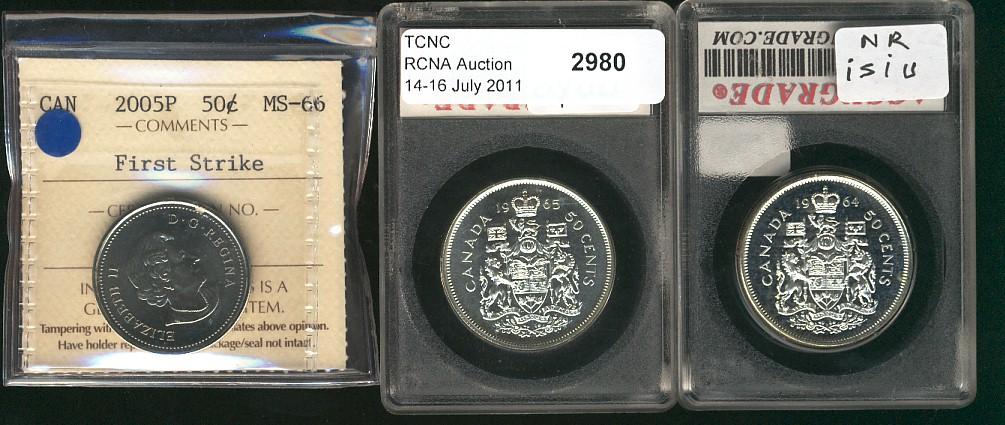 2005P 50¢ First Strike ICCS MS66 along with 1964 ACG MS66 & 1965 ACG PL66. Lot of 3 coins.