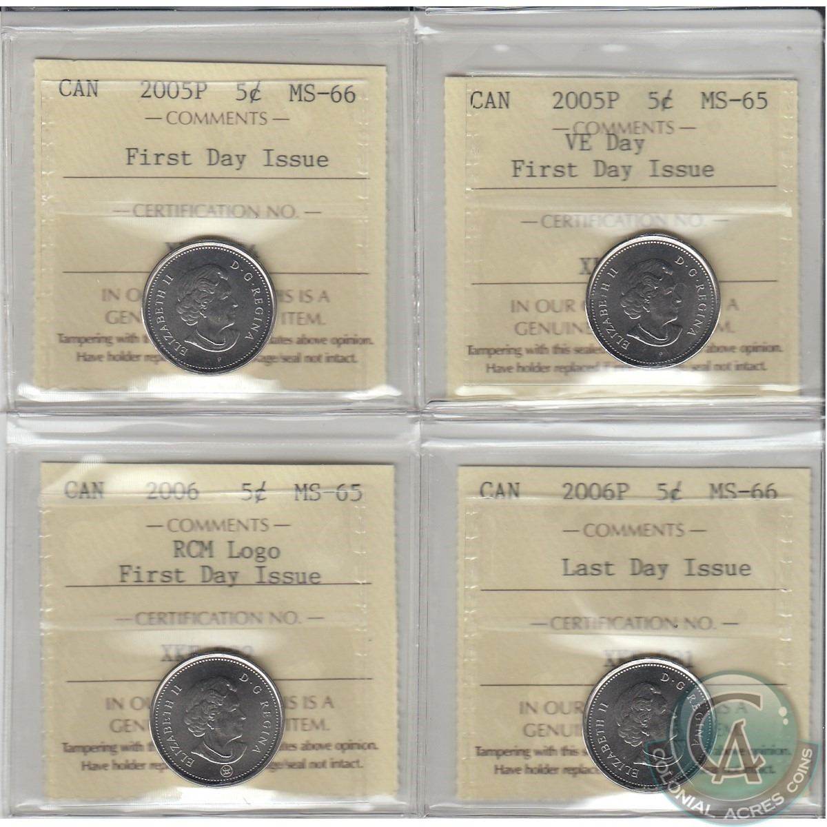 2005P VE Day, 2005P , 2006 RCM Logo, 2006P Canada 5-cent All ICCS Certified coins. your will receive the 2005P VE Day 5c MS-65 First Day of Issue, 2005P 5c MS-66 FDC First day of Issue, 2006 RCM Logo 5c MS-65 First Day of issue, and the 2006P 5c MS-66 Last Day of Issue.