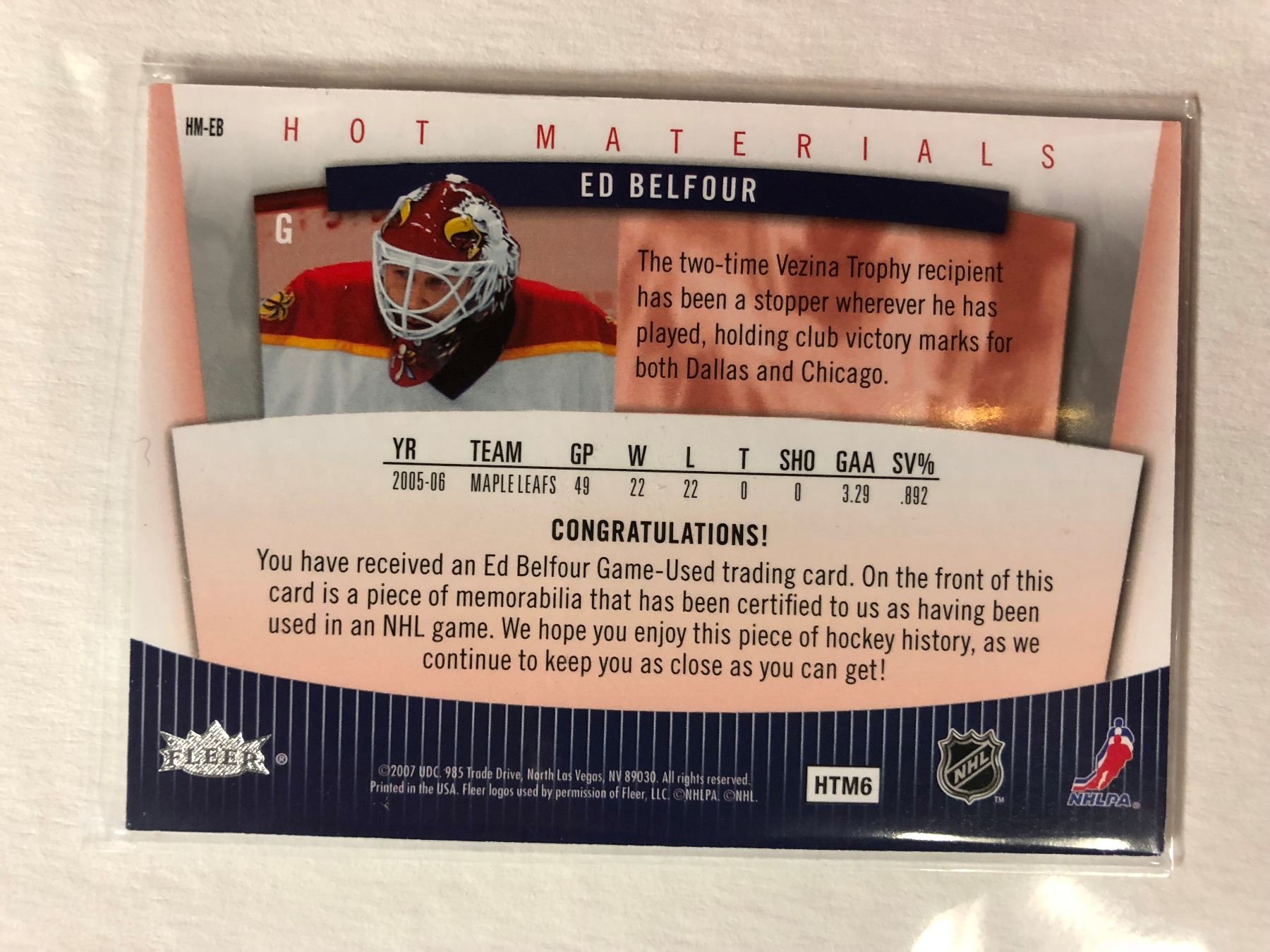 2006-07 FLEER HOT MATERIALS ED BELFOUR HOCKEY CARD