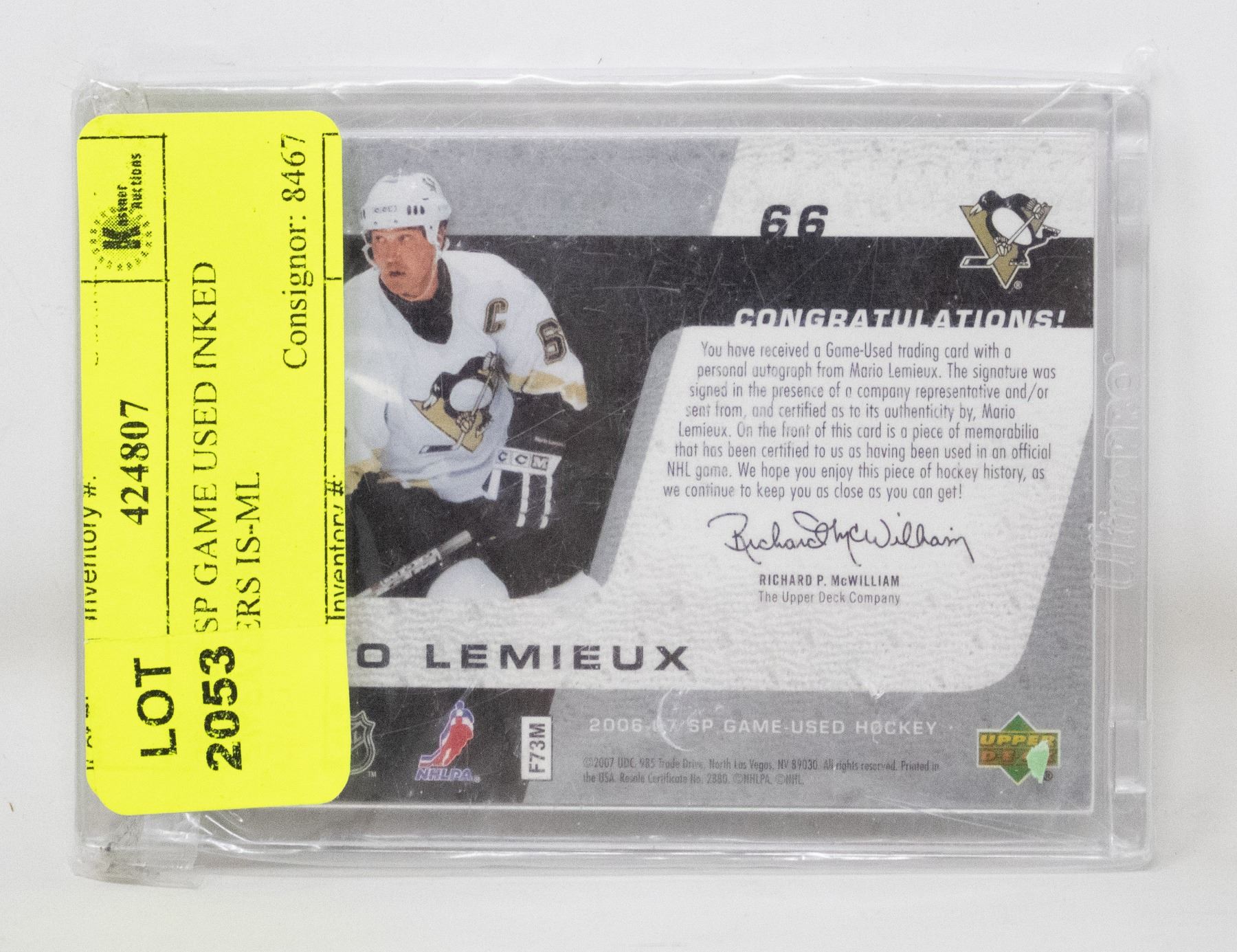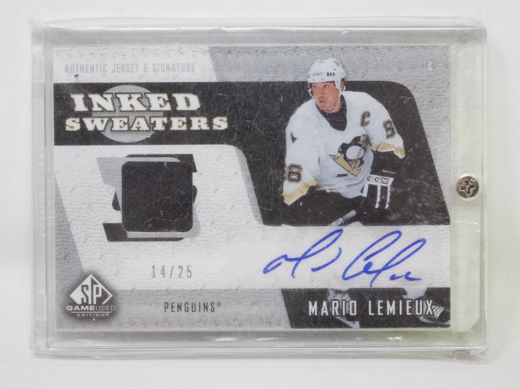 MARIO LEMIEUX AUTOGRAPH AND GAMED USED MEMORABILIA. 14/25. ONLY 25 OF THESE CARDS WERE EVER PRODUCED. *ALL BIDS SUBJECT TO BANK BAILIFF OR OWNERS APPROVAL*