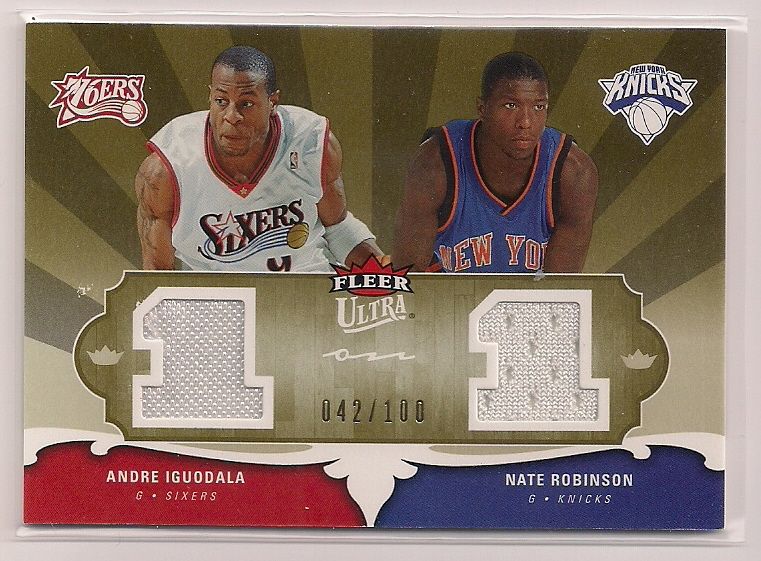 2006-07 Ultra Andre Iguodala/Nate Robinson Dual Game-Used Material Insert Card. This Insert features a Solid White piece of Game-Used Material from each player, and is serial numbered 042/100! Card is Near Mint.