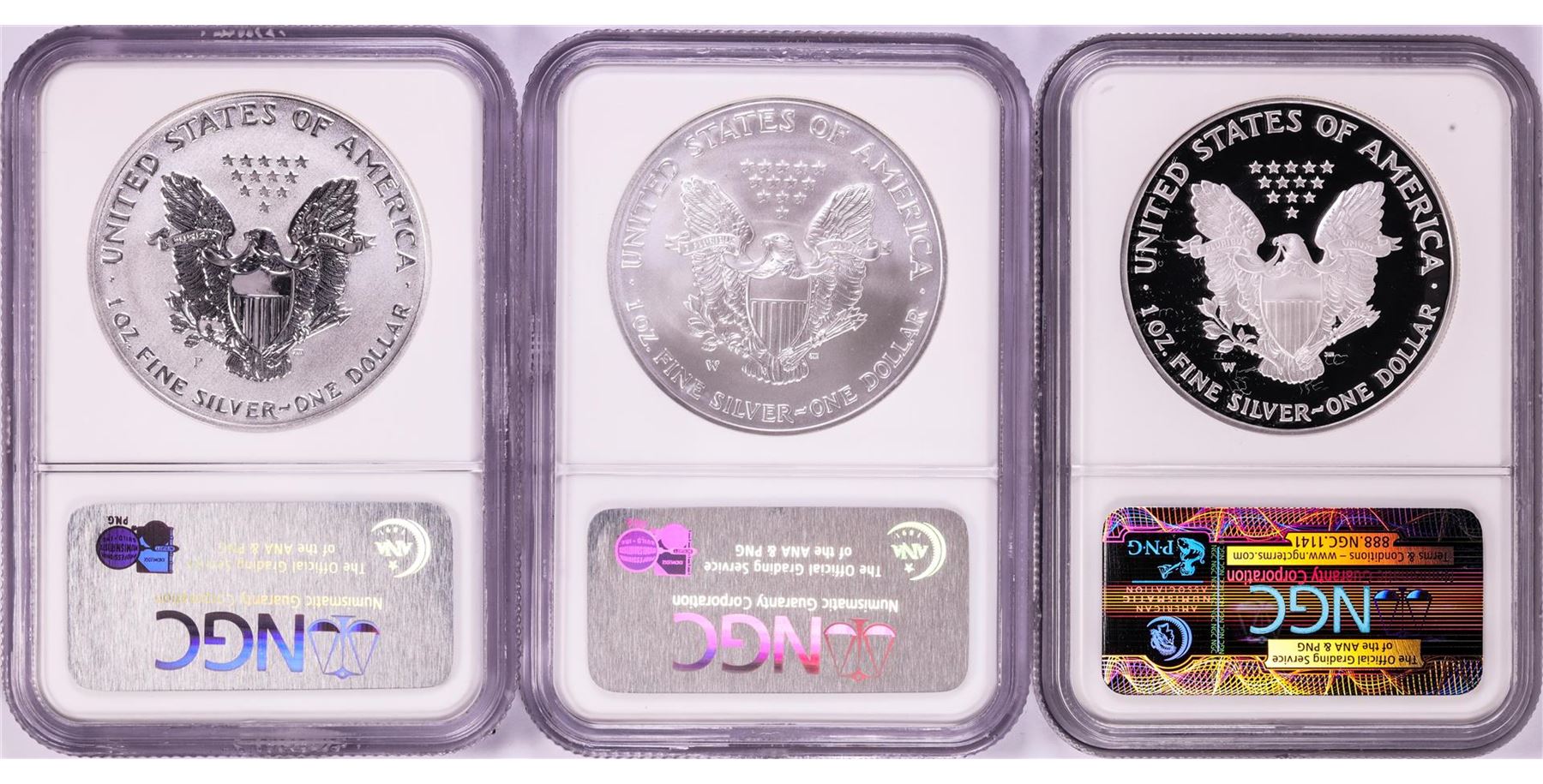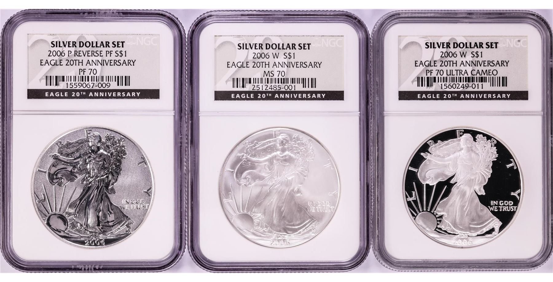 One 2006 $1 American Silver Eagle 20th Anniversary (3) Coin Set NGC MS70/PF70/PF70 Ultra Cameo. NGC Certified.