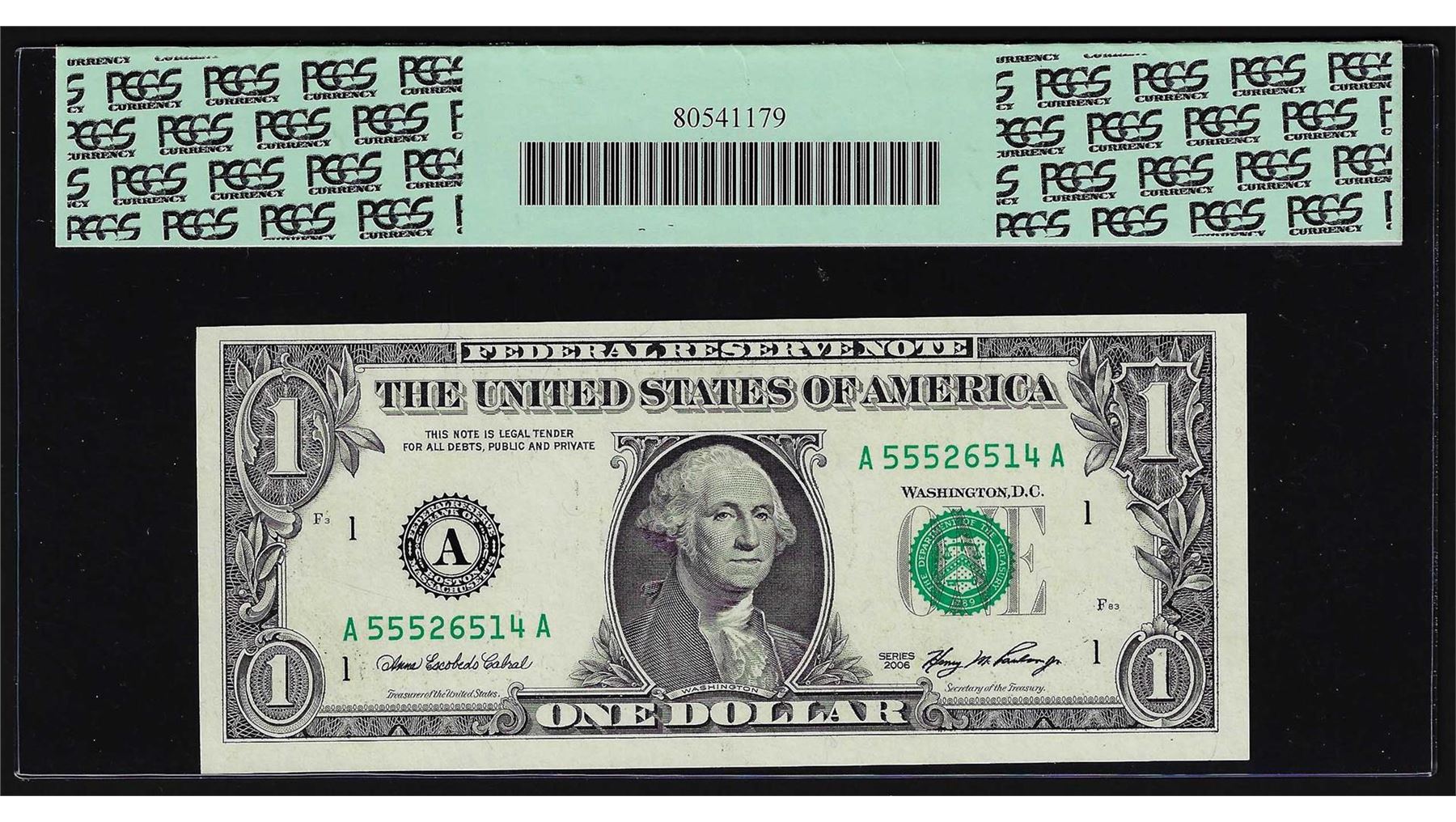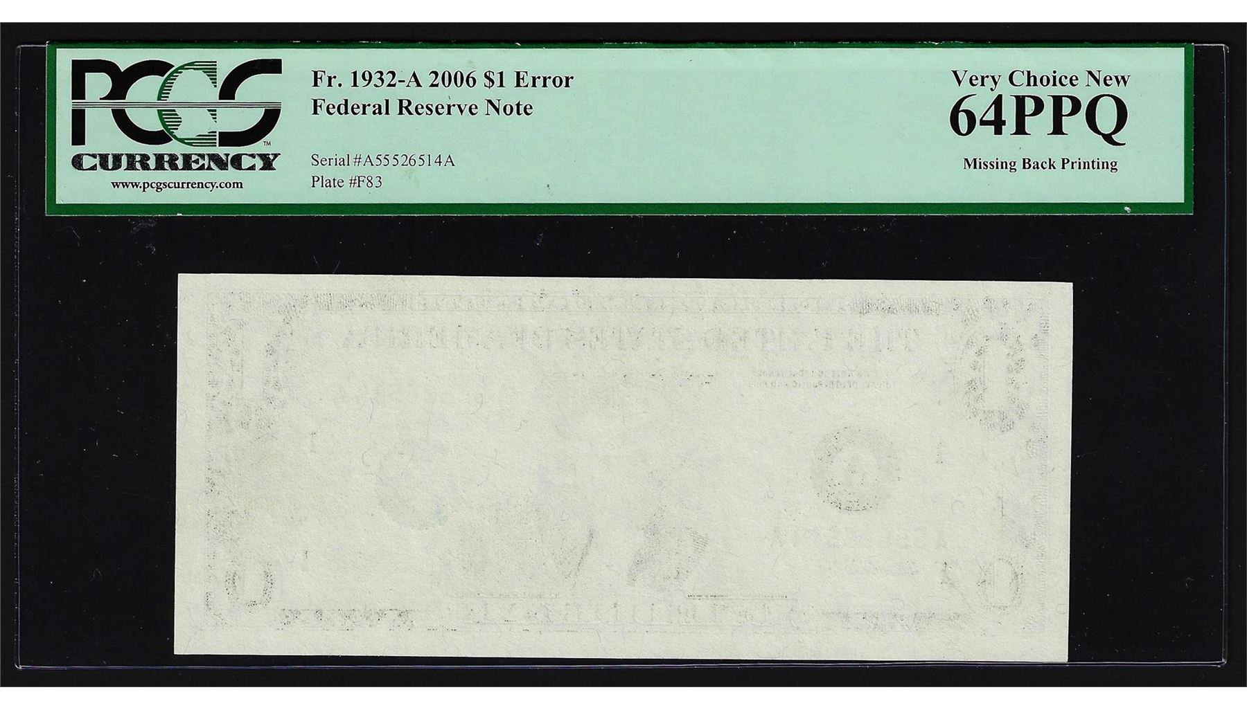 One 2006 $1 Federal Reserve Note ERROR Missing Back Printing PCGS Very Choice New 64PPQ. PCGS Graded.