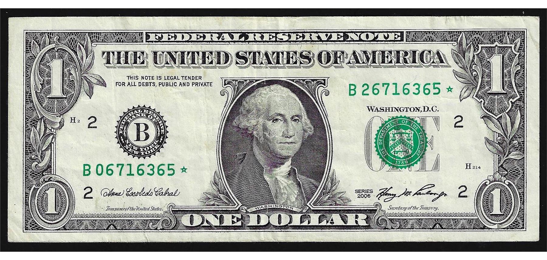 One 2006 $1 Federal Reserve STAR Note ERROR Mismatch Serial Number.