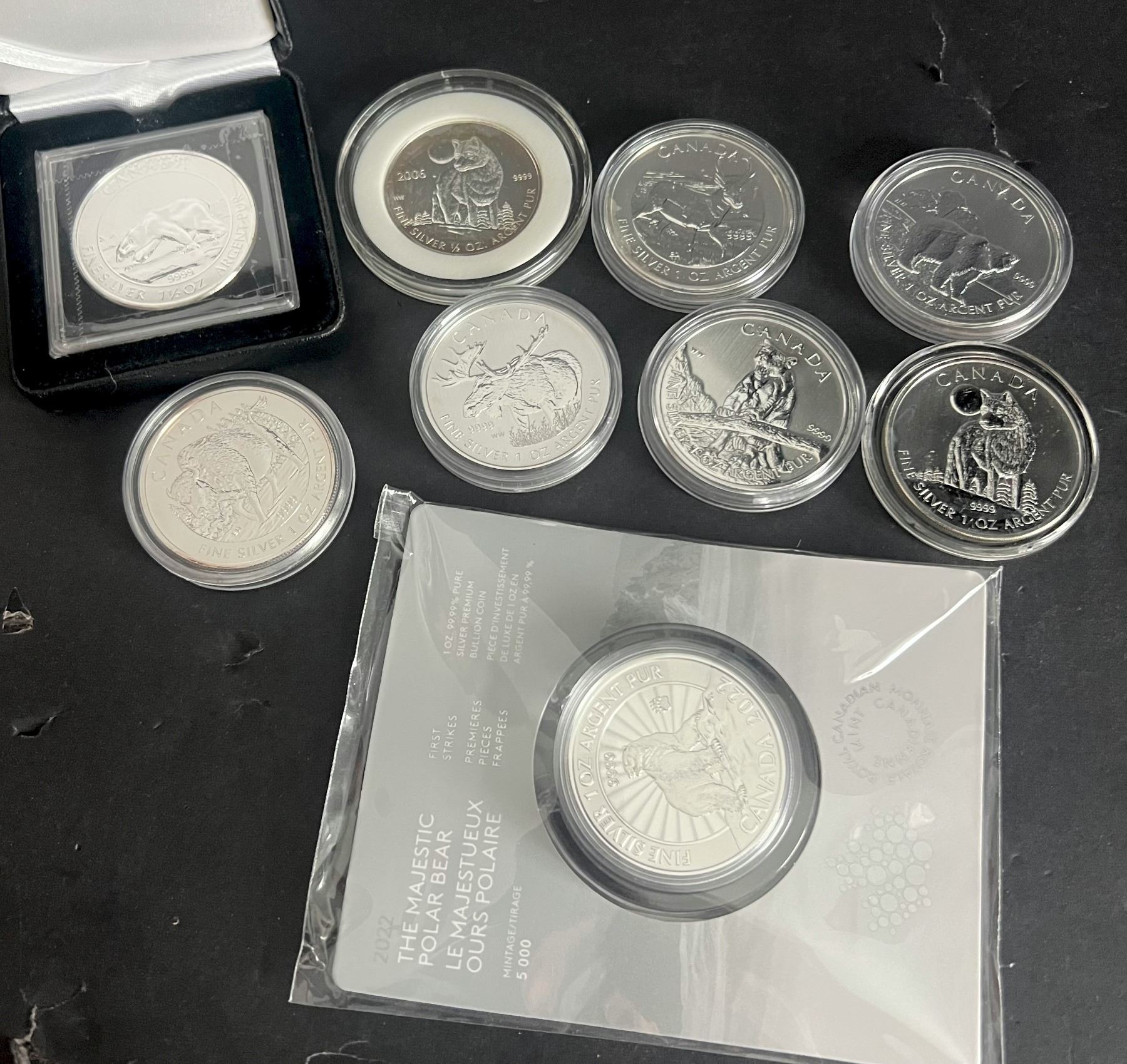 2006 $1 Fine Silver 1/2 oz Timber Wolf, 2011 $5 1oz Timber Wolf, 2011 $5 Grizzly, 2012 $5 Moose, 201