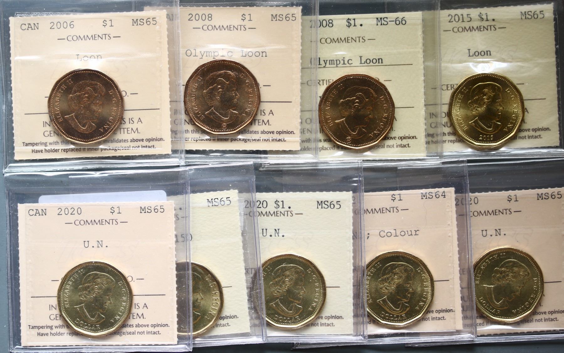 2006 $1 Loon to 2020 Lot of 9 coins all Graded ICCS Gem Mint State-65 to Superb Gem Mint State-66. See Pic.