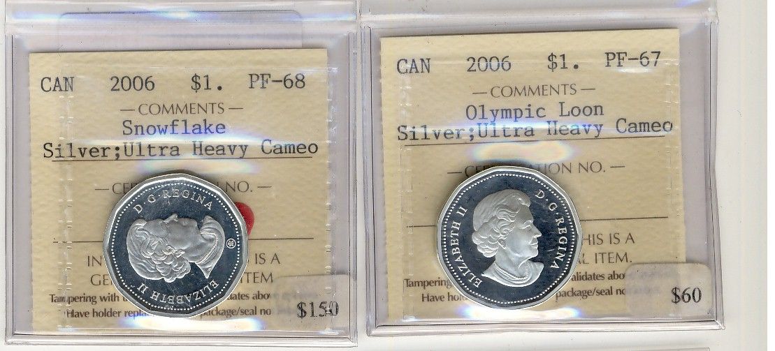 2006 $1 Olympic Silver Loon PF67 HC & 2006 Snowflake Silver PF68 UHC. Lot of 2 coins.