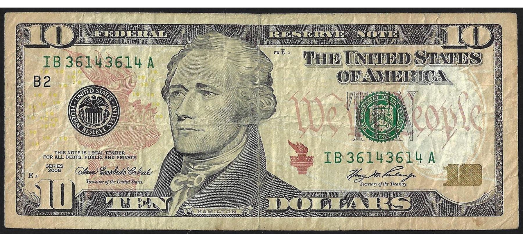 One 2006 $10 Federal Reserve Note Fancy Repeater Serial Number.