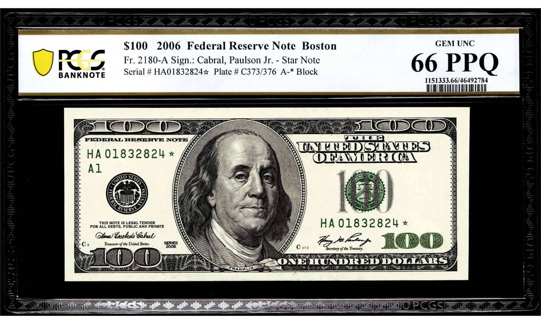 2006 $100 Federal Reserve STAR Note Boston Fr.2180-A* PCGS Gem Uncirculated 66PPQ