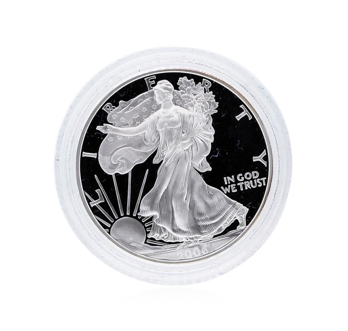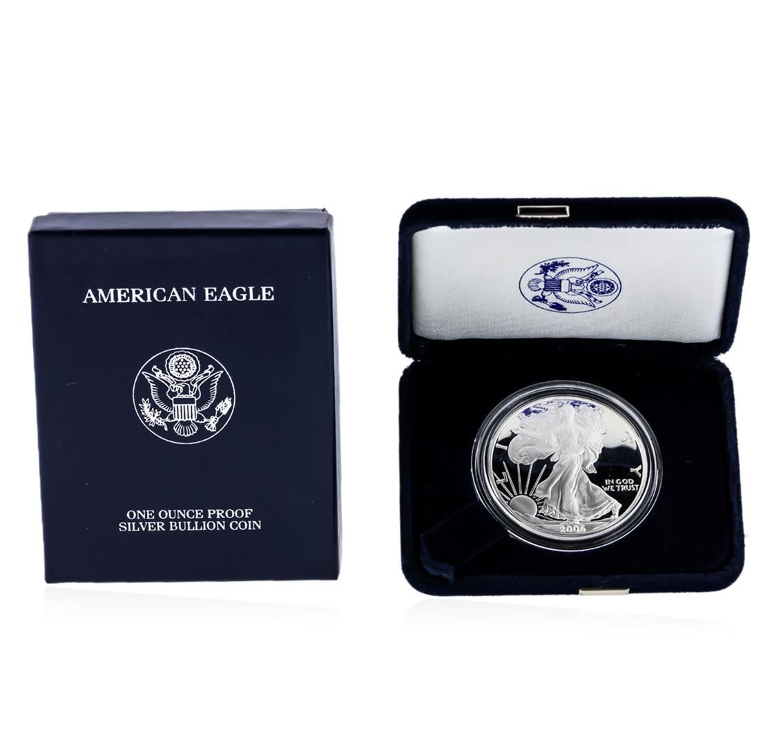 One 2006 1oz American Silver Eagle Proof Coin with Box and Certificate of Authenticity. This Silver American Eagle coin's limited mintage makes it a popular choice for any collector.