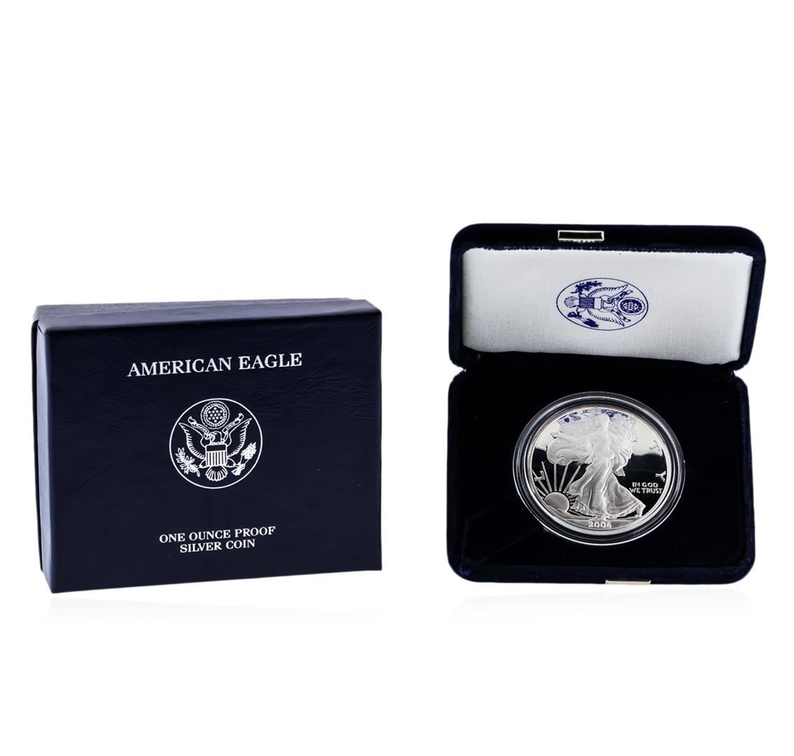 One 2006 1oz American Silver Eagle Proof Coin with Box and Certificate of Authenticity. This Silver American Eagle coin's limited mintage makes it a popular choice for any collector.
