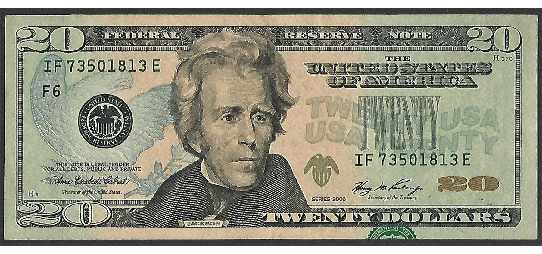 One 2006 $20 Federal Reserve Note Print Overprint Shift Error.