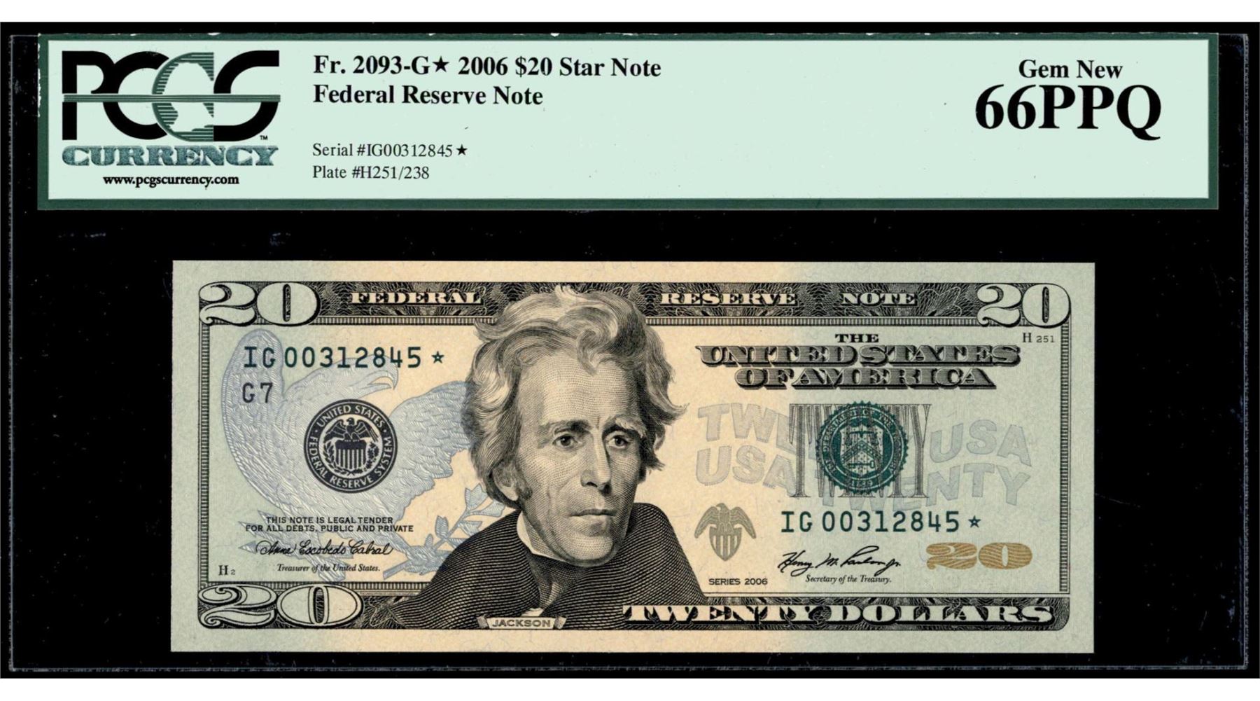 One 2006 $20 Federal Reserve STAR Note Fr.2093-G* PCGS Gem New 66PPQ. PCGS Graded.