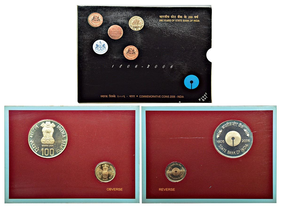 2006, 200 Years of State Bank of India, Proof set of 2 coins, 100 rupees and 5 rupees, Kolkata mint, RB 296, in original mint packing.