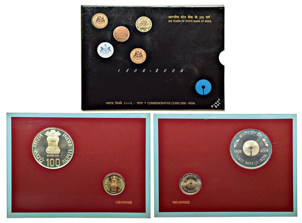 2006, 200 Years of State Bank of India, Proof set of 2 coins, 100 rupees and 5 rupees, Kolkata mint, RB 296, in original mint packing.