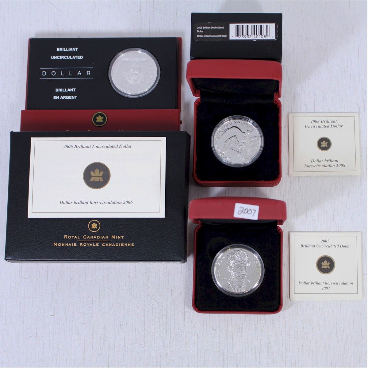 2006, 2007 & 2008 Canada Brilliant Uncirculated Silver Dollars. TAX Exempt (2007 is missing the outer sleeve & 2008 has a toning spot). 3pcs