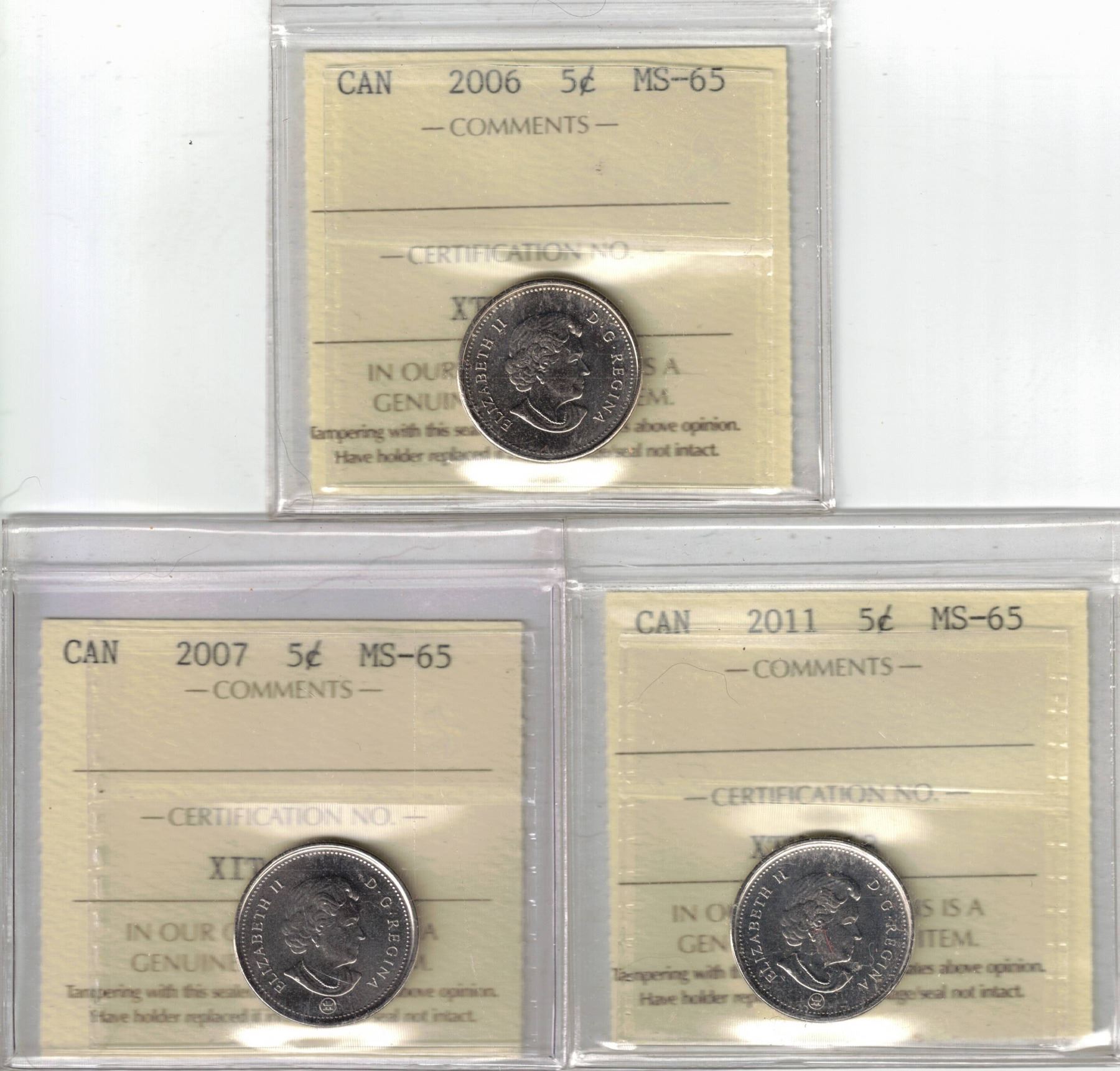 2006-2007-2011- 5¢ ICCS MS65 3Pcs