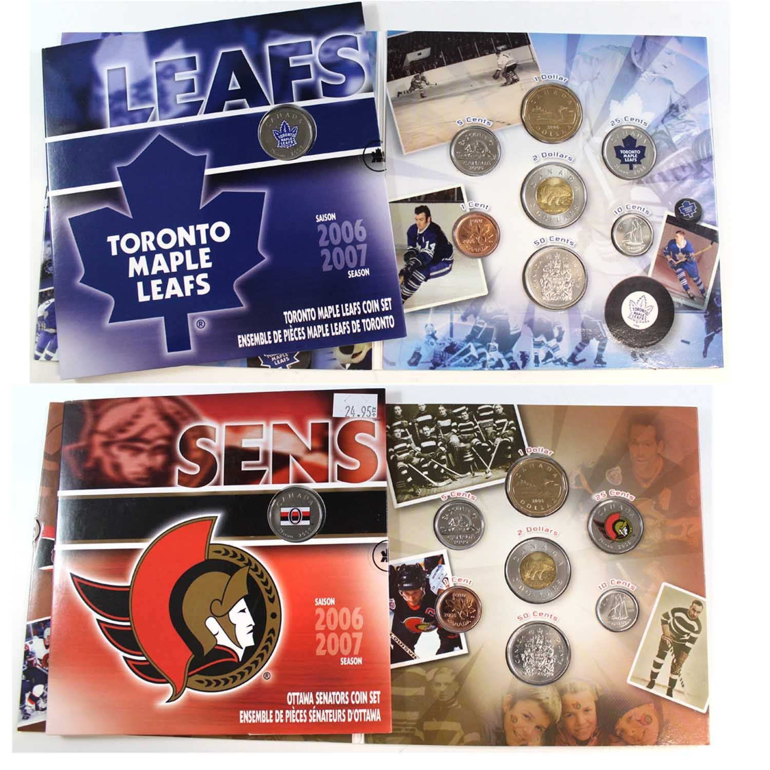 2006-2007 Canada NHL 7-coin Gift Set Collection. You will receive 2006 Ottawa Senators, 2006 Toronto Maple Leads, 2007 Ottawa Senators, and 2007 Toronto Maple Leafs. 4 sets.
