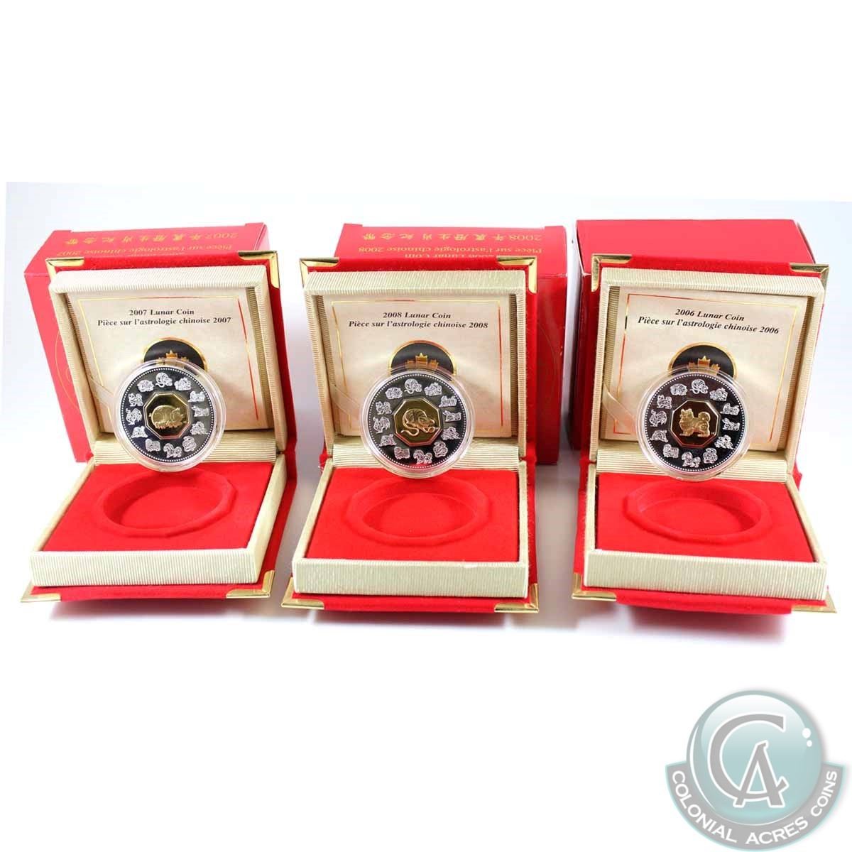 2006-2008 Canada $15 Lunar Sterling Silver Coin Collection. You will receive the 2006 Dog, 2007 Pig, and 2008 Rat. Please note coins are lightly toned. 3pcs
