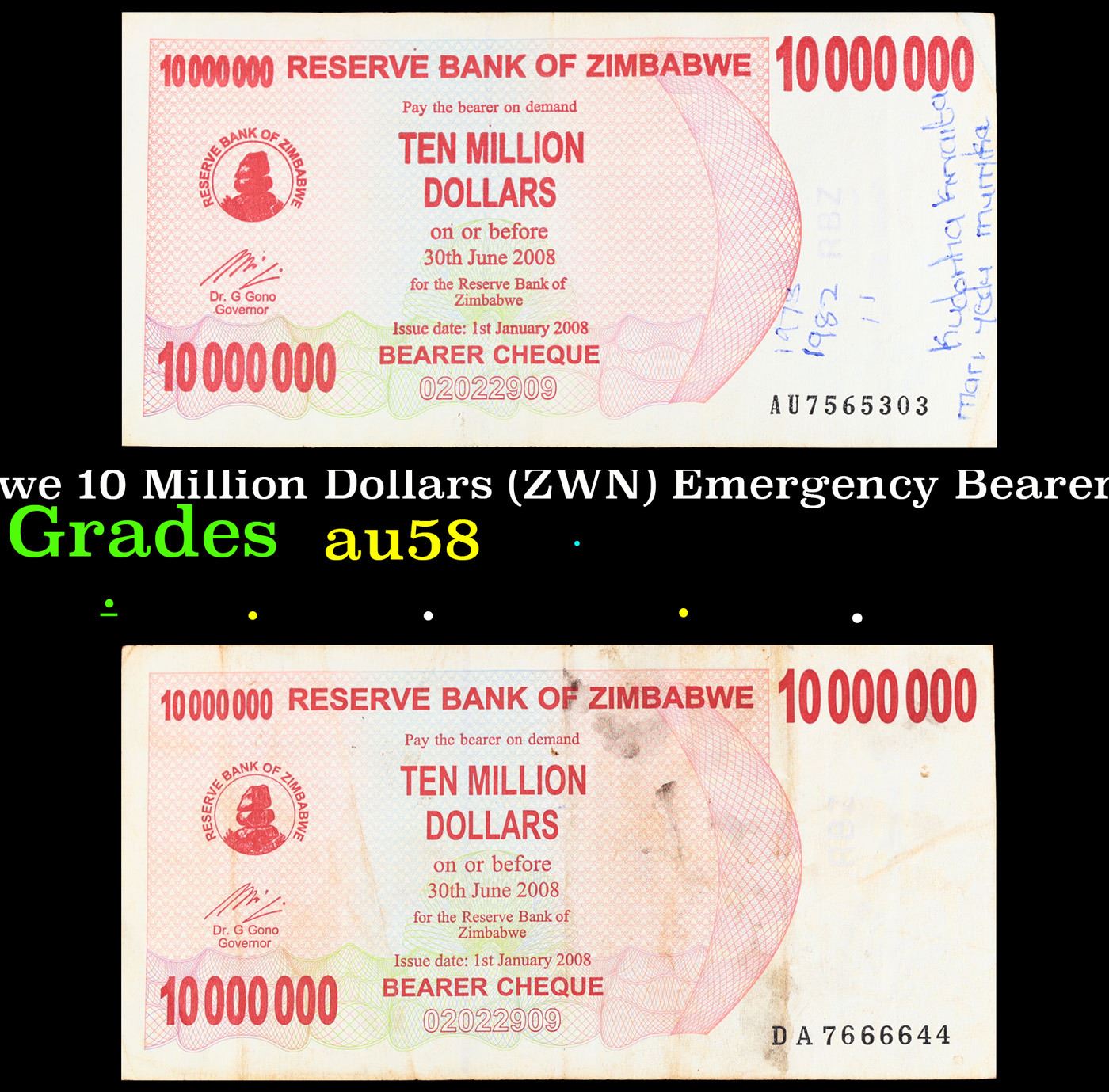2006-2008 Zimbabwe 10 Million Dollars (ZWN) Emergency Bearer Check Notes P# 55a Grades Choice AU/BU