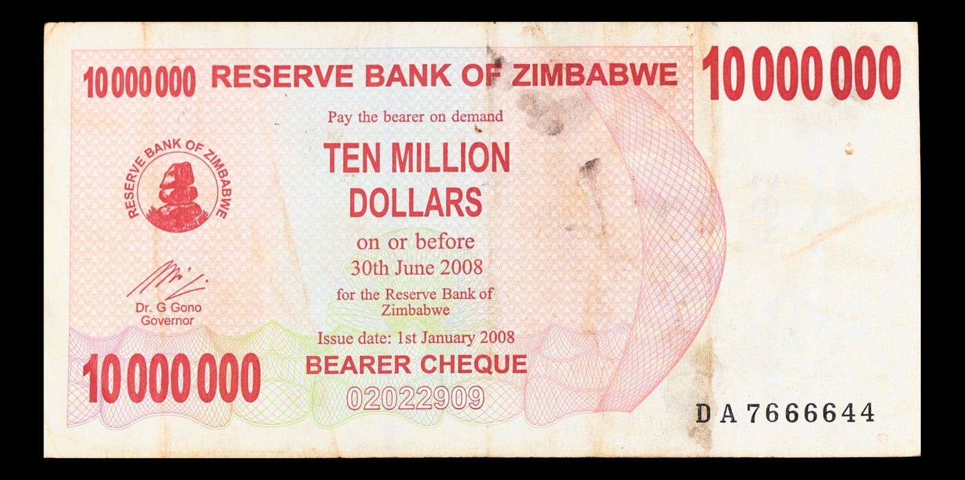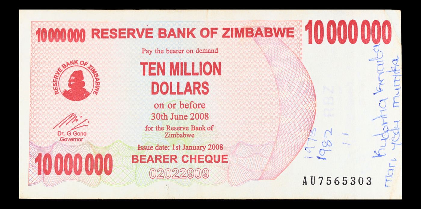 2006-2008 Zimbabwe 10 Million Dollars (ZWN) Emergency Bearer Check Notes P# 55a Grades Choice AU/BU Slider. Hyperinflation in Zimbabwe is an ongoing crisis. While yearly inflation was often measured in the hundreds of percentage points in the early 2000s, from 2007 to 2008 it was measured in the millions, and then trillions. The first Zimbabwean dollar (ZWD) was abandoned in 2005 and replaced with the second (ZWN). The second had to be abandoned again in August 2008, and its replacement currency (ZWR) became obsolete due to ongoing hyperinflation only 6 months later, resulting in a third replacement currency (ZWL). The ZWL was formally demonetised in 2015, and Zimbabwe generally relies on a variety of foreign currencies for local trade.