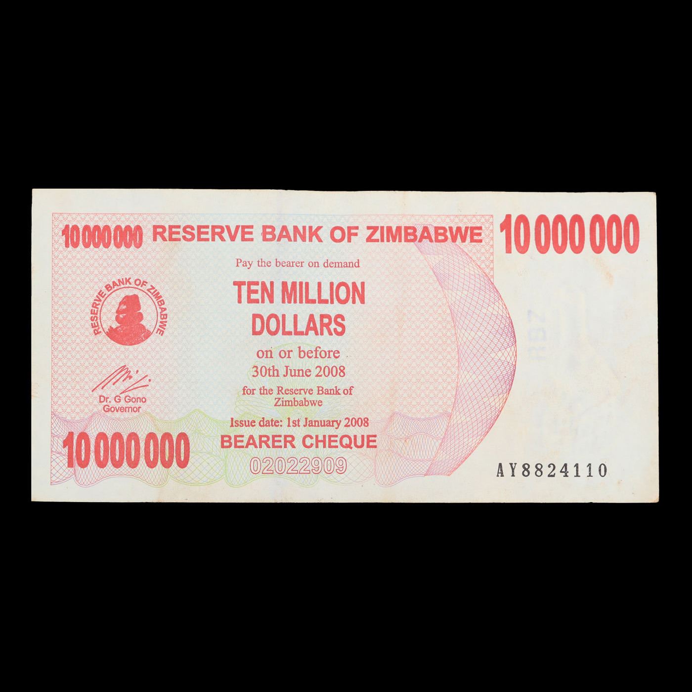 2006-2008 Zimbabwe 10 Million Dollars (ZWN) Emergency Bearer Check Notes P# 55a Grades Choice AU. Hyperinflation in Zimbabwe is an ongoing crisis. While yearly inflation was often measured in the hundreds of percentage points in the early 2000s, from 2007 to 2008 it was measured in the millions, and then trillions. The first Zimbabwean dollar (ZWD) was abandoned in 2005 and replaced with the second (ZWN). The second had to be abandoned again in August 2008, and its replacement currency (ZWR) became obsolete due to ongoing hyperinflation only 6 months later, resulting in a third replacement currency (ZWL). The ZWL was formally demonetised in 2015, and Zimbabwe generally relies on a variety of foreign currencies for local trade.