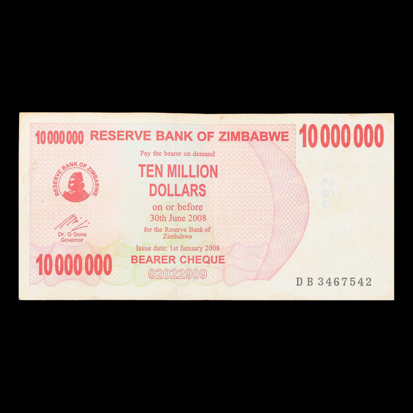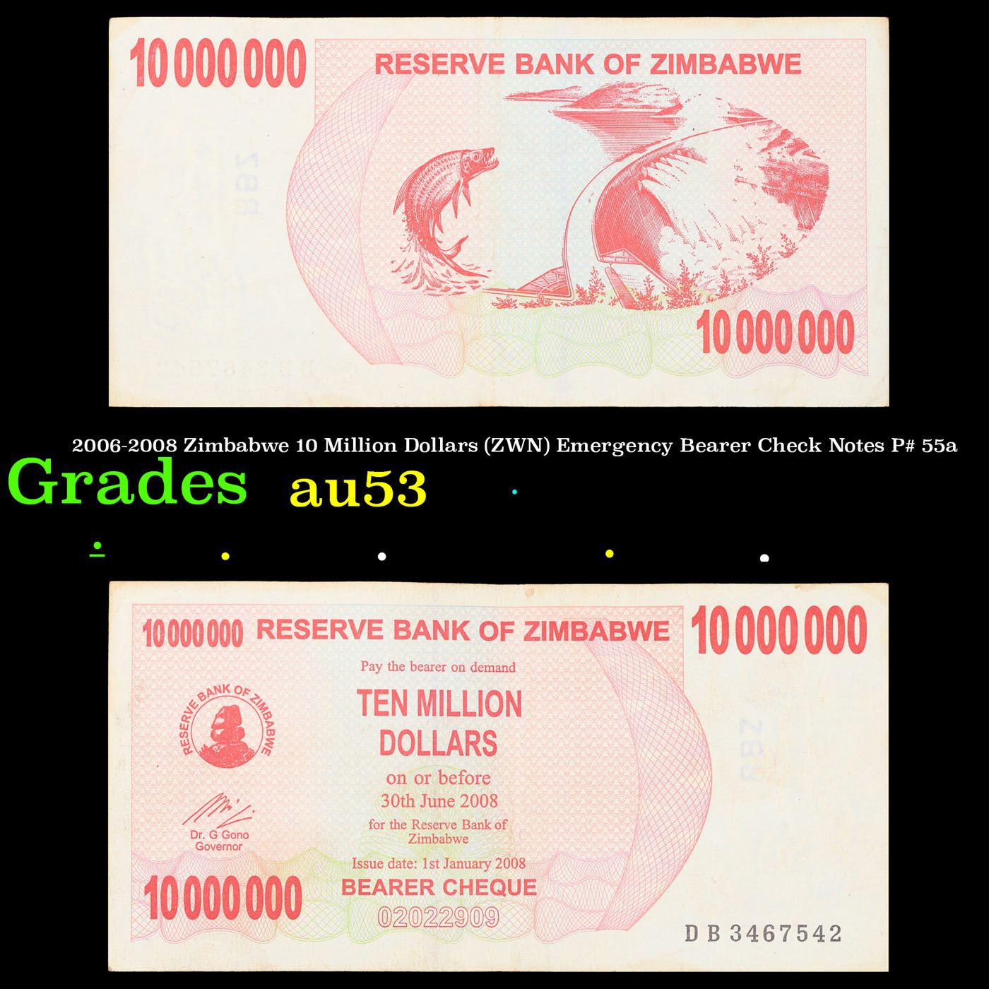 2006-2008 Zimbabwe 10 Million Dollars (ZWN) Emergency Bearer Check Notes P# 55a Grades Select AU. Hyperinflation in Zimbabwe is an ongoing crisis. While yearly inflation was often measured in the hundreds of percentage points in the early 2000s, from 2007 to 2008 it was measured in the millions, and then trillions. The first Zimbabwean dollar (ZWD) was abandoned in 2005 and replaced with the second (ZWN). The second had to be abandoned again in August 2008, and its replacement currency (ZWR) became obsolete due to ongoing hyperinflation only 6 months later, resulting in a third replacement currency (ZWL). The ZWL was formally demonetised in 2015, and Zimbabwe generally relies on a variety of foreign currencies for local trade.