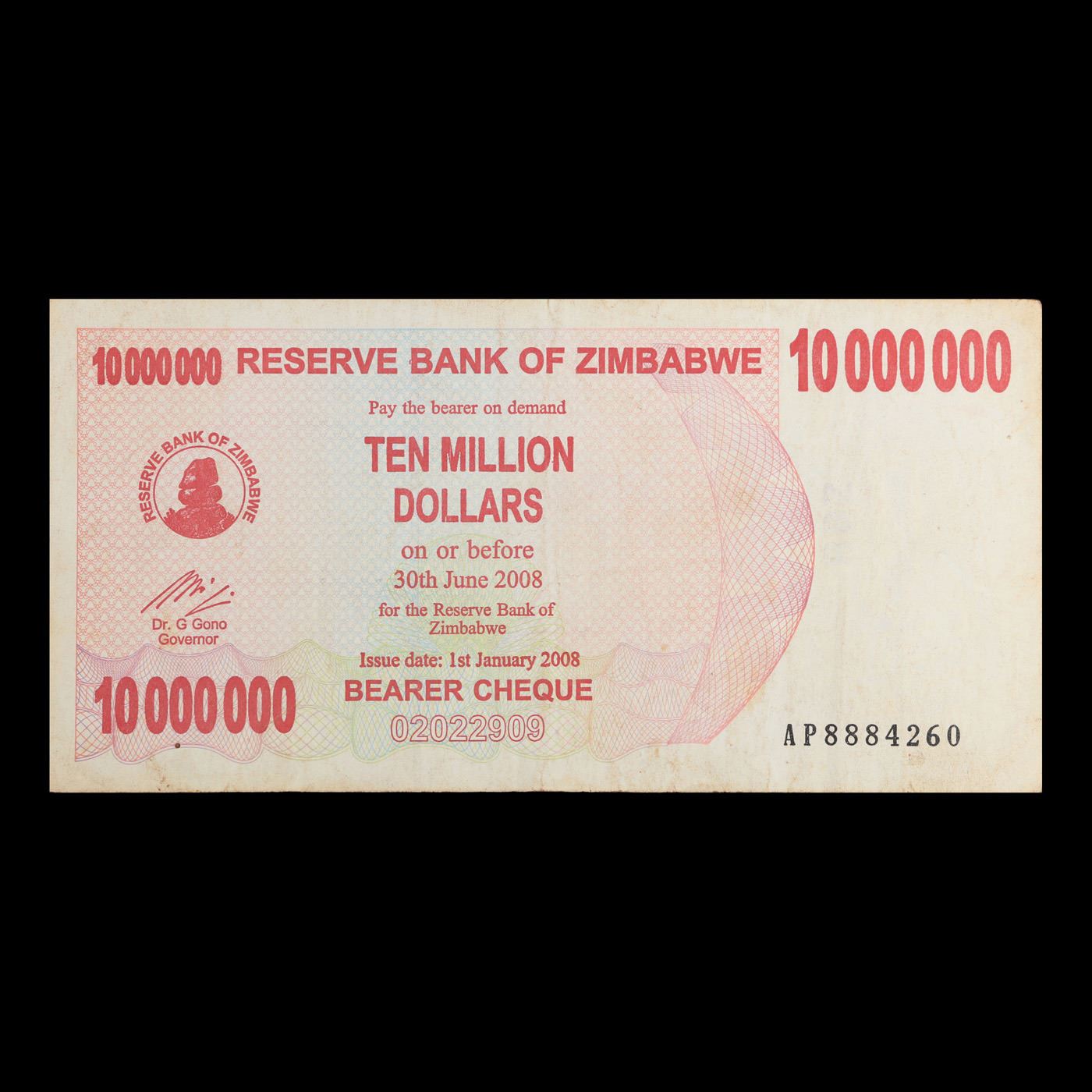2006-2008 Zimbabwe 10 Million Dollars (ZWN) Emergency Bearer Check Notes P# 55a Grades Select AU. Hyperinflation in Zimbabwe is an ongoing crisis. While yearly inflation was often measured in the hundreds of percentage points in the early 2000s, from 2007 to 2008 it was measured in the millions, and then trillions. The first Zimbabwean dollar (ZWD) was abandoned in 2005 and replaced with the second (ZWN). The second had to be abandoned again in August 2008, and its replacement currency (ZWR) became obsolete due to ongoing hyperinflation only 6 months later, resulting in a third replacement currency (ZWL). The ZWL was formally demonetised in 2015, and Zimbabwe generally relies on a variety of foreign currencies for local trade.