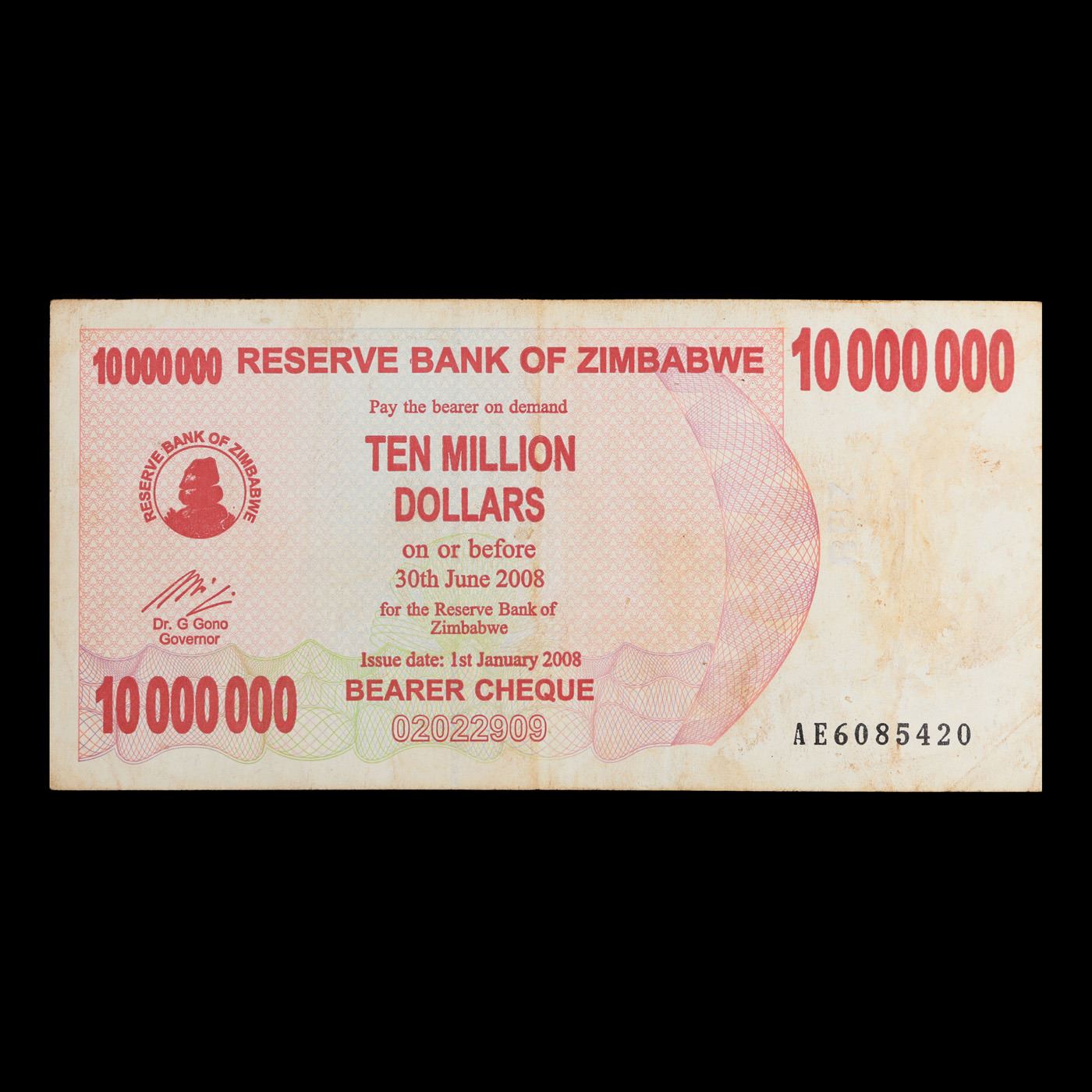 2006-2008 Zimbabwe 10 Million Dollars (ZWN) Emergency Bearer Check Notes P# 55a Grades Select AU. Hyperinflation in Zimbabwe is an ongoing crisis. While yearly inflation was often measured in the hundreds of percentage points in the early 2000s, from 2007 to 2008 it was measured in the millions, and then trillions. The first Zimbabwean dollar (ZWD) was abandoned in 2005 and replaced with the second (ZWN). The second had to be abandoned again in August 2008, and its replacement currency (ZWR) became obsolete due to ongoing hyperinflation only 6 months later, resulting in a third replacement currency (ZWL). The ZWL was formally demonetised in 2015, and Zimbabwe generally relies on a variety of foreign currencies for local trade.