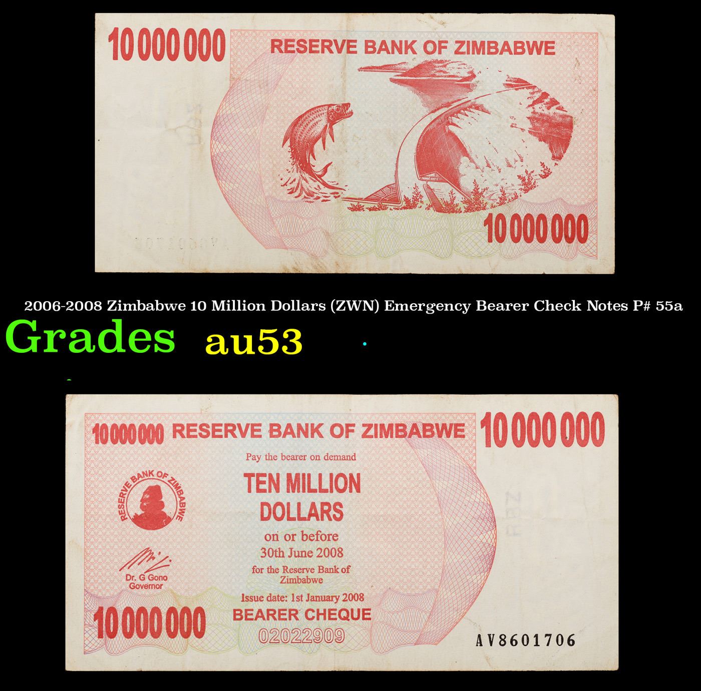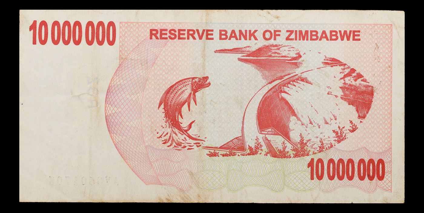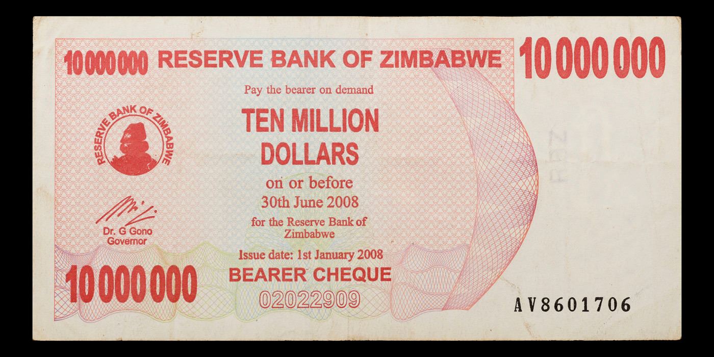 2006-2008 Zimbabwe 10 Million Dollars (ZWN) Emergency Bearer Check Notes P# 55a Grades Select AU. Hyperinflation in Zimbabwe is an ongoing crisis. While yearly inflation was often measured in the hundreds of percentage points in the early 2000s, from 2007 to 2008 it was measured in the millions, and then trillions. The first Zimbabwean dollar (ZWD) was abandoned in 2005 and replaced with the second (ZWN). The second had to be abandoned again in August 2008, and its replacement currency (ZWR) became obsolete due to ongoing hyperinflation only 6 months later, resulting in a third replacement currency (ZWL). The ZWL was formally demonetised in 2015, and Zimbabwe generally relies on a variety of foreign currencies for local trade.