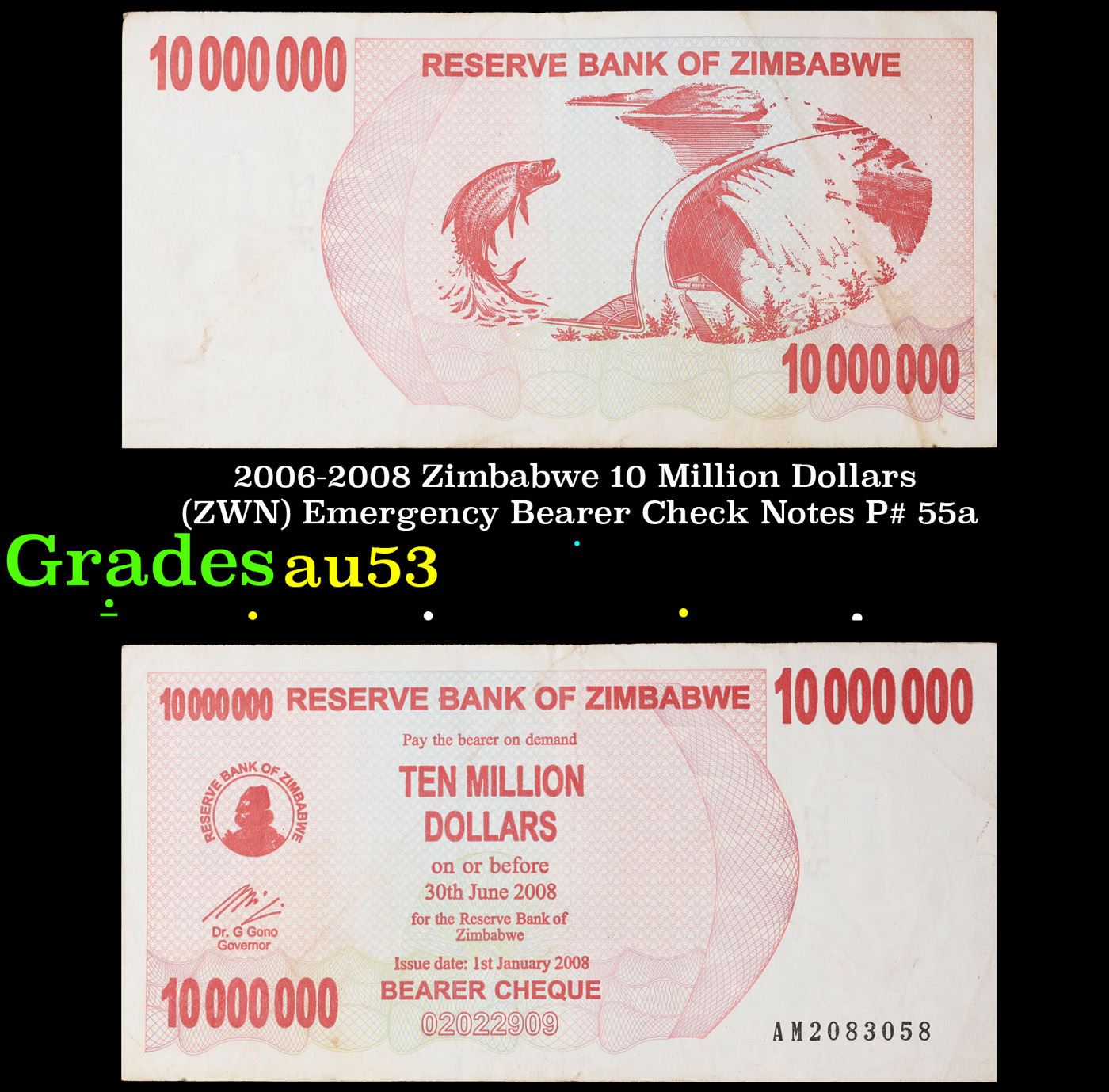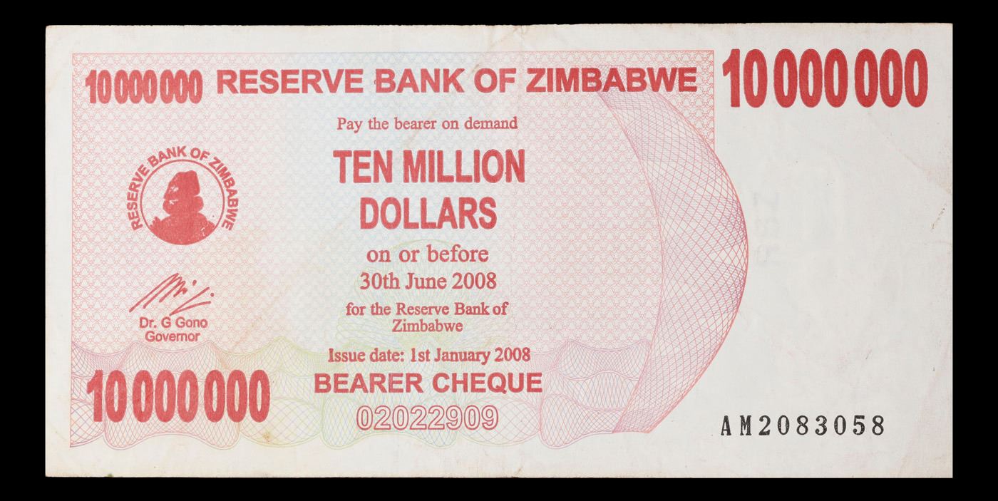 2006-2008 Zimbabwe 10 Million Dollars (ZWN) Emergency Bearer Check Notes P# 55a Grades Select AU. Hyperinflation in Zimbabwe is an ongoing crisis. While yearly inflation was often measured in the hundreds of percentage points in the early 2000s, from 2007 to 2008 it was measured in the millions, and then trillions. The first Zimbabwean dollar (ZWD) was abandoned in 2005 and replaced with the second (ZWN). The second had to be abandoned again in August 2008, and its replacement currency (ZWR) became obsolete due to ongoing hyperinflation only 6 months later, resulting in a third replacement currency (ZWL). The ZWL was formally demonetised in 2015, and Zimbabwe generally relies on a variety of foreign currencies for local trade.