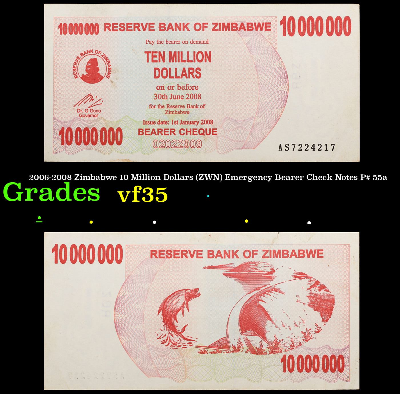 2006-2008 Zimbabwe 10 Million Dollars (ZWN) Emergency Bearer Check Notes P# 55a Grades vf++