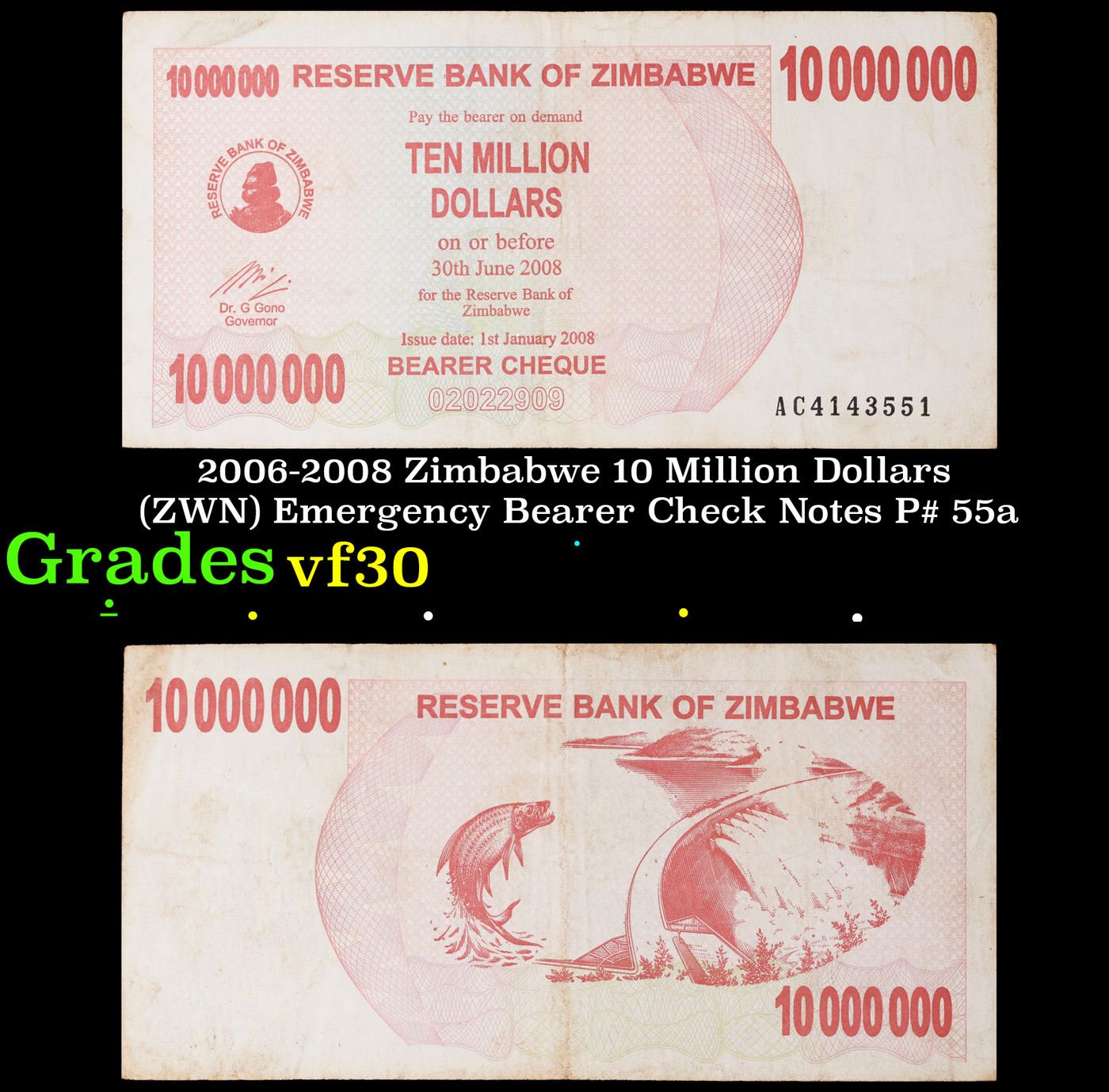 2006-2008 Zimbabwe 10 Million Dollars (ZWN) Emergency Bearer Check Notes P# 55a Grades vf++