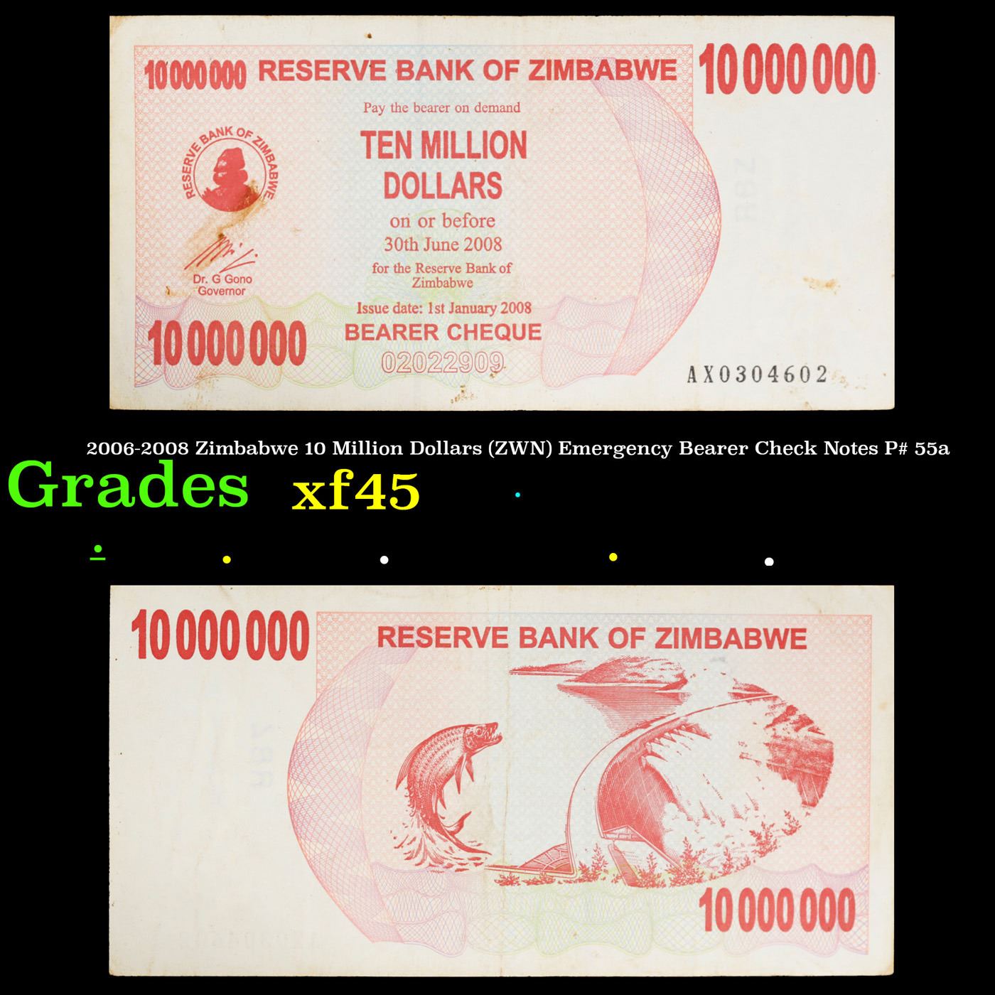 2006-2008 Zimbabwe 10 Million Dollars (ZWN) Emergency Bearer Check Notes P# 55a Grades xf+