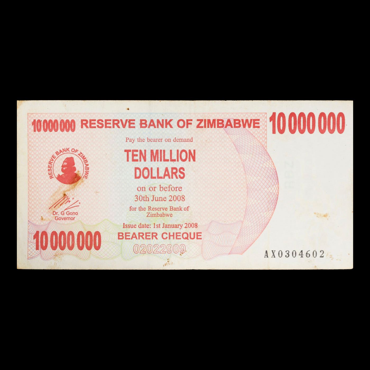 2006-2008 Zimbabwe 10 Million Dollars (ZWN) Emergency Bearer Check Notes P# 55a Grades xf+. Hyperinflation in Zimbabwe is an ongoing crisis. While yearly inflation was often measured in the hundreds of percentage points in the early 2000s, from 2007 to 2008 it was measured in the millions, and then trillions. The first Zimbabwean dollar (ZWD) was abandoned in 2005 and replaced with the second (ZWN). The second had to be abandoned again in August 2008, and its replacement currency (ZWR) became obsolete due to ongoing hyperinflation only 6 months later, resulting in a third replacement currency (ZWL). The ZWL was formally demonetised in 2015, and Zimbabwe generally relies on a variety of foreign currencies for local trade.