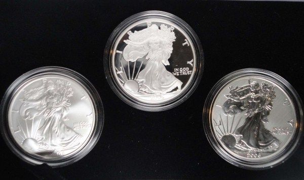 SET CONTAINS THREE AMERICAN SILVER EAGLE IN SPECIAL BOX, EXCELLENT ORIGINAL PACKAGING AND CERTIFICATE, EST. $425.00 TO $450.00