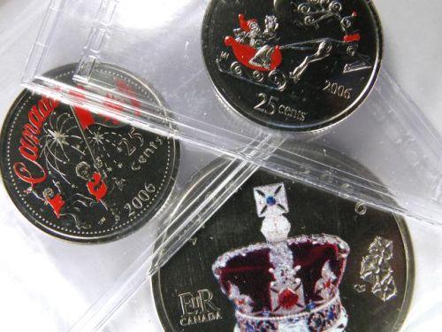 Canada Silver Dollar 2006 80th Birthday. Plus Twenty-Five Cents 2006P Canada Day and 2006 Rudolph. Total three Colourized Pieces, all ICCS MS-67 Numismatic BU
