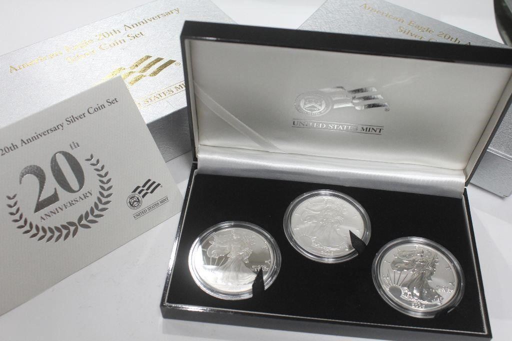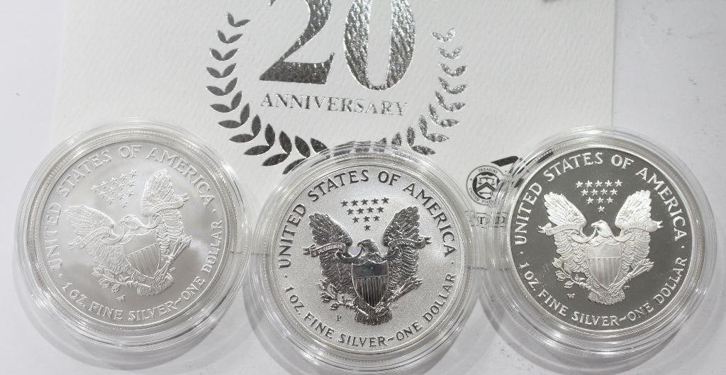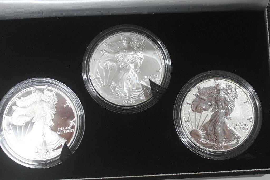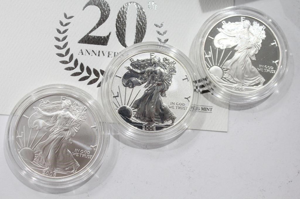 The 2006 3 Piece American Silver Eagle Set in Original Box with COA, This set contains the first reverse Proof Silver Eagle., Plus the first W and the standard Proof ASE. Sold as high as $650.00, A great buy at this level.